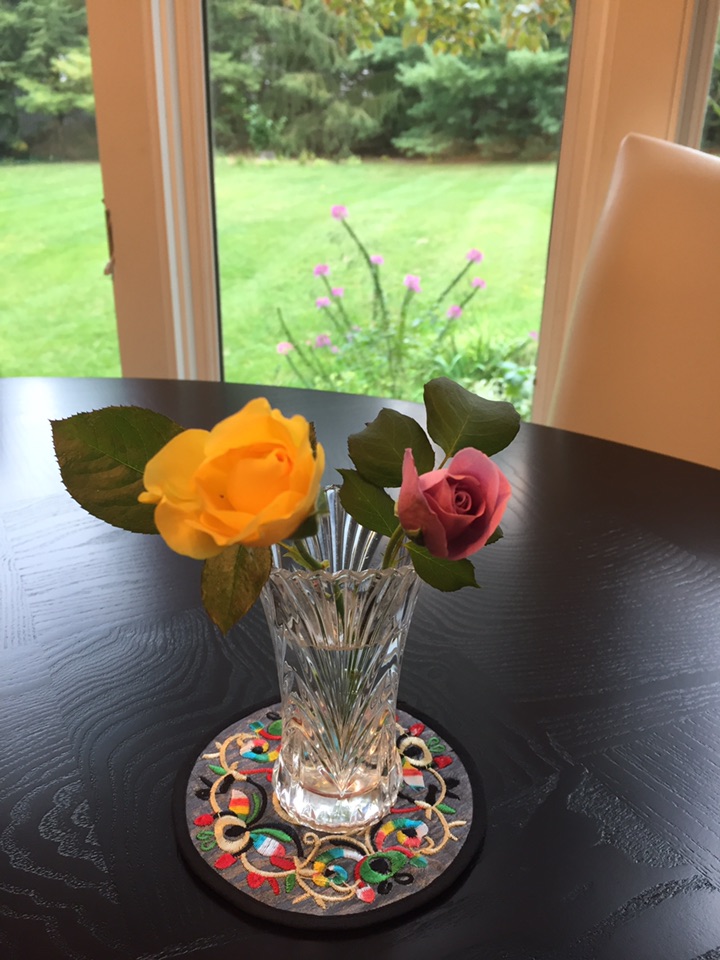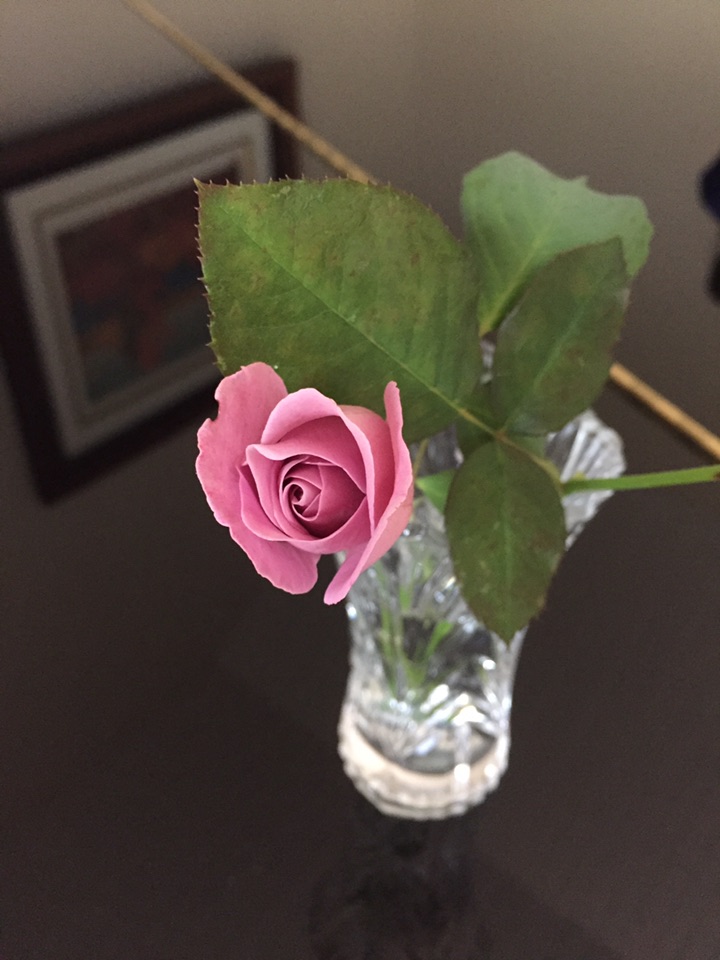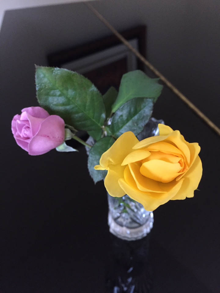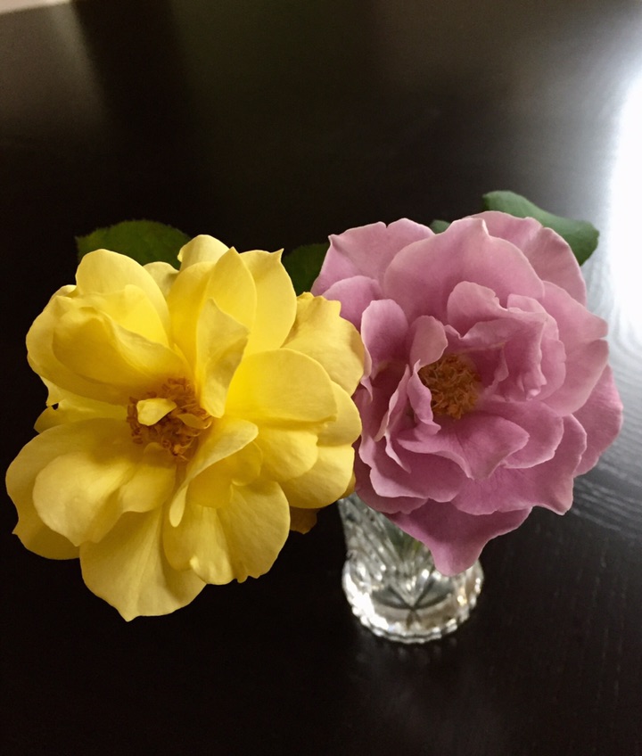 早上剪回来两朵小小的月季花 一黄一紫 应该是今年花园里最后的月季花了吧?看她们在晨风中孤孤单单的身影 想着放室内花瓶里会暖和些、持续时间长些...