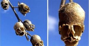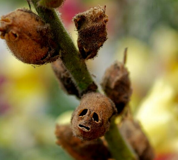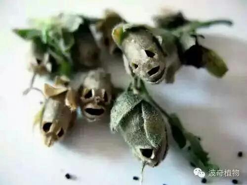 其实这是金鱼草的果实,果实成熟以后就会裂开几个孔散播种子,这些孔正好组成骷髅的形状。