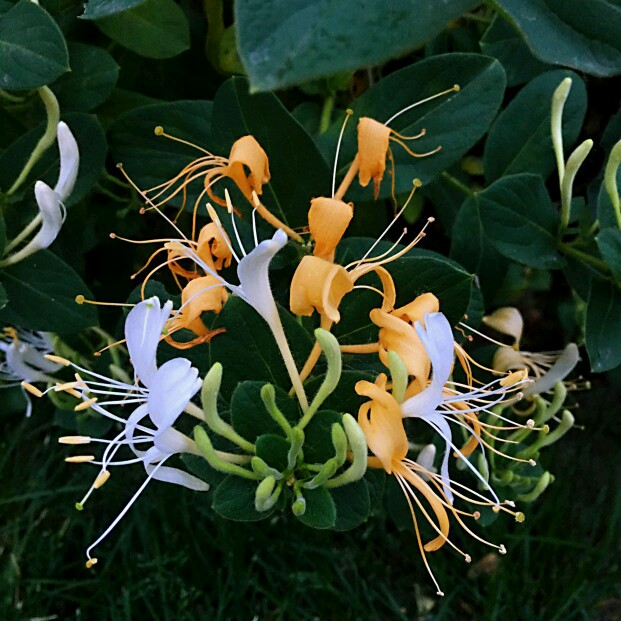 发现了一张忍冬(金银花)的图片,和金银忍冬(金银木)比,的确花蕊长,叶片圆一点。