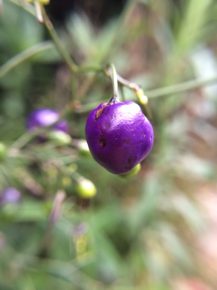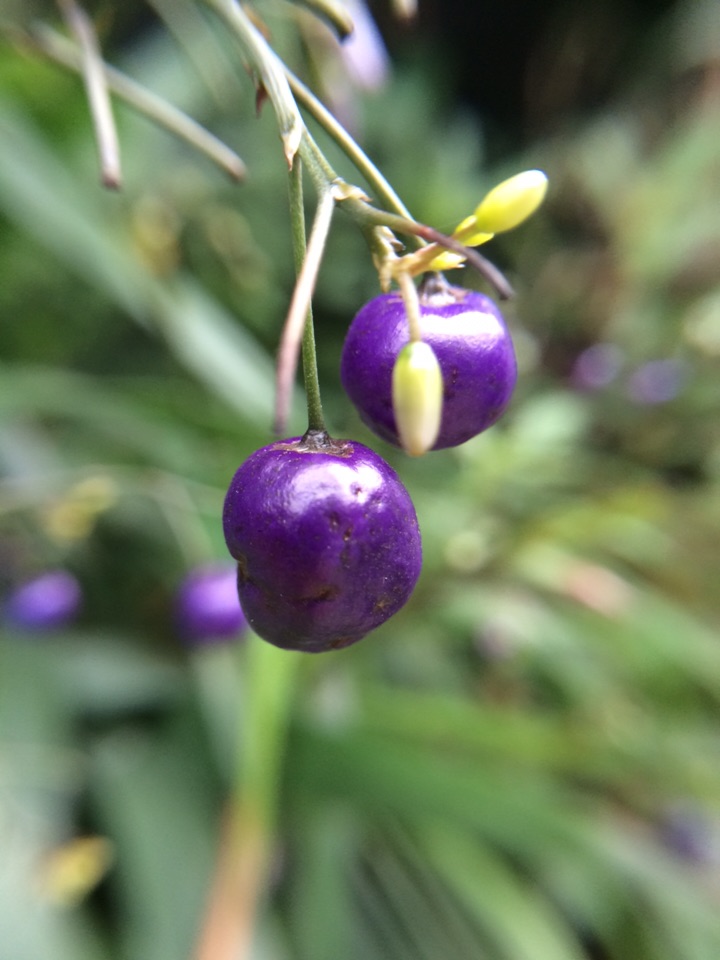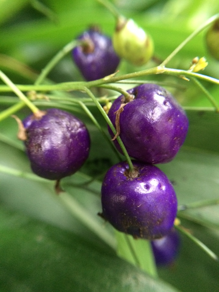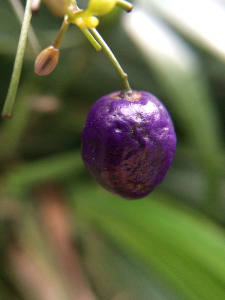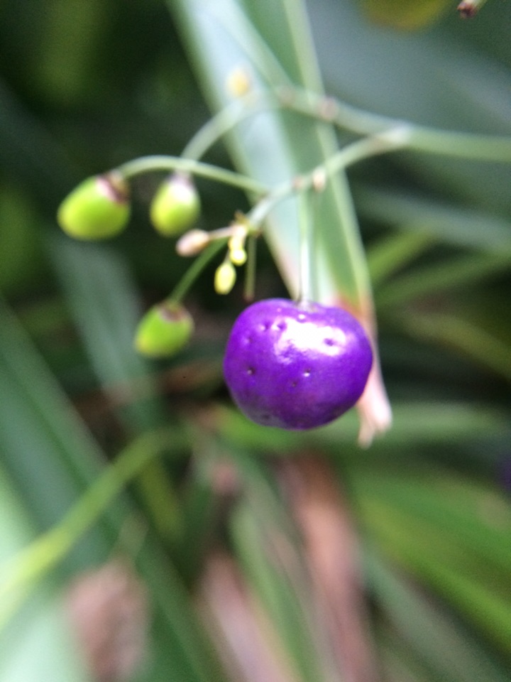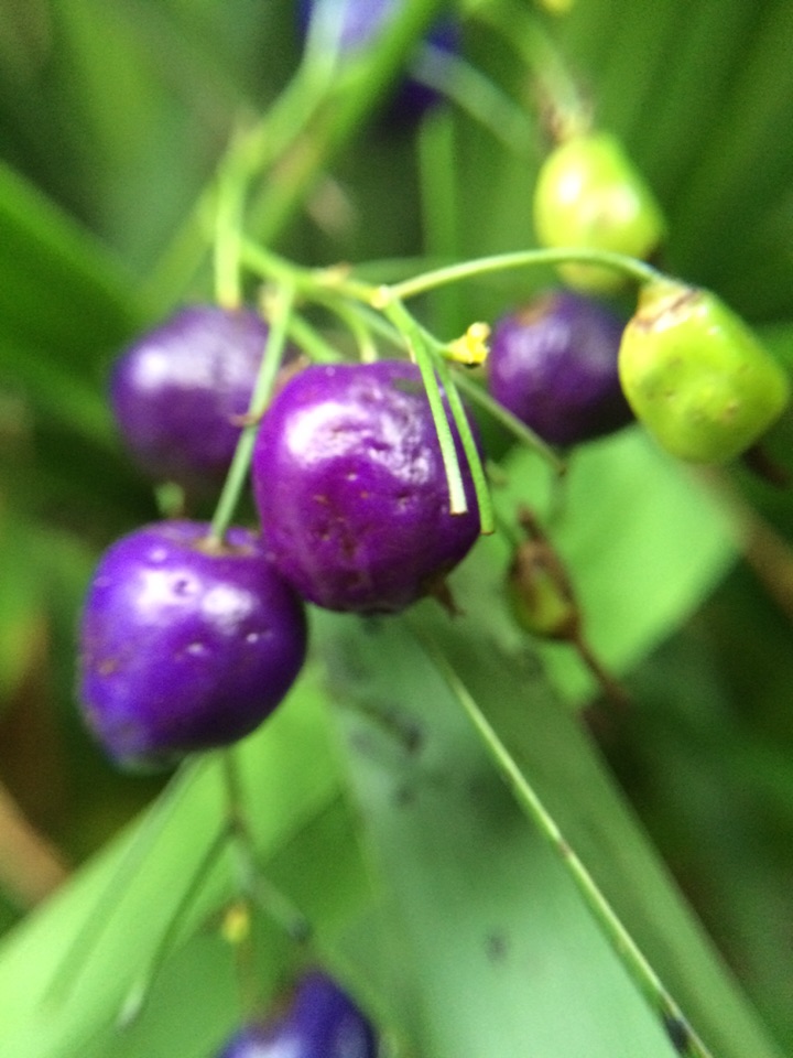 昨天晨练,在山边发现几株叶狭条状披针形植物长着深蓝色发亮的果果,极为艳美,仔细观察确定是山菅兰,大家看看是吗?