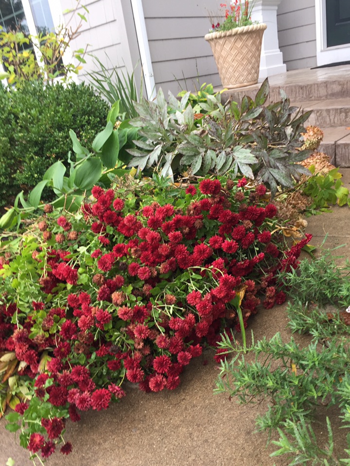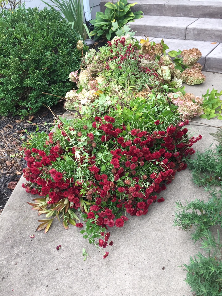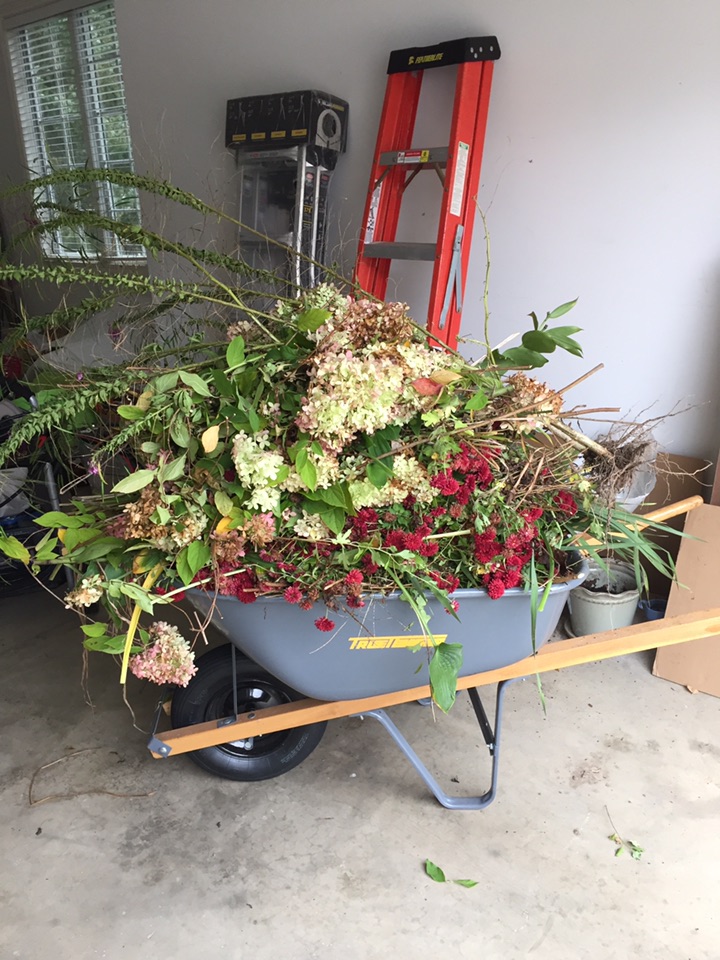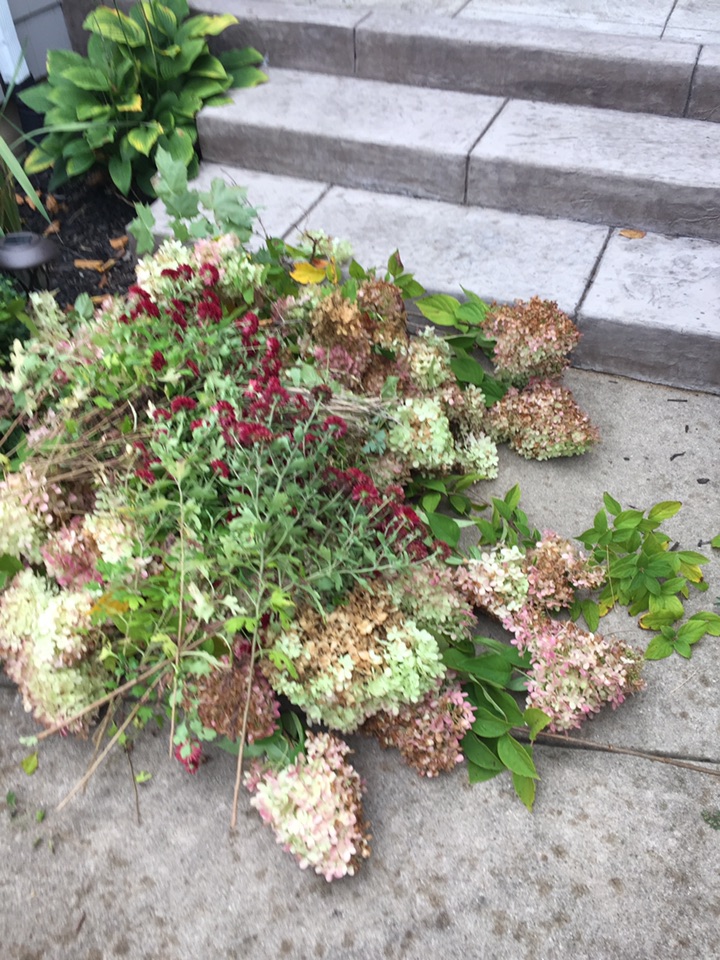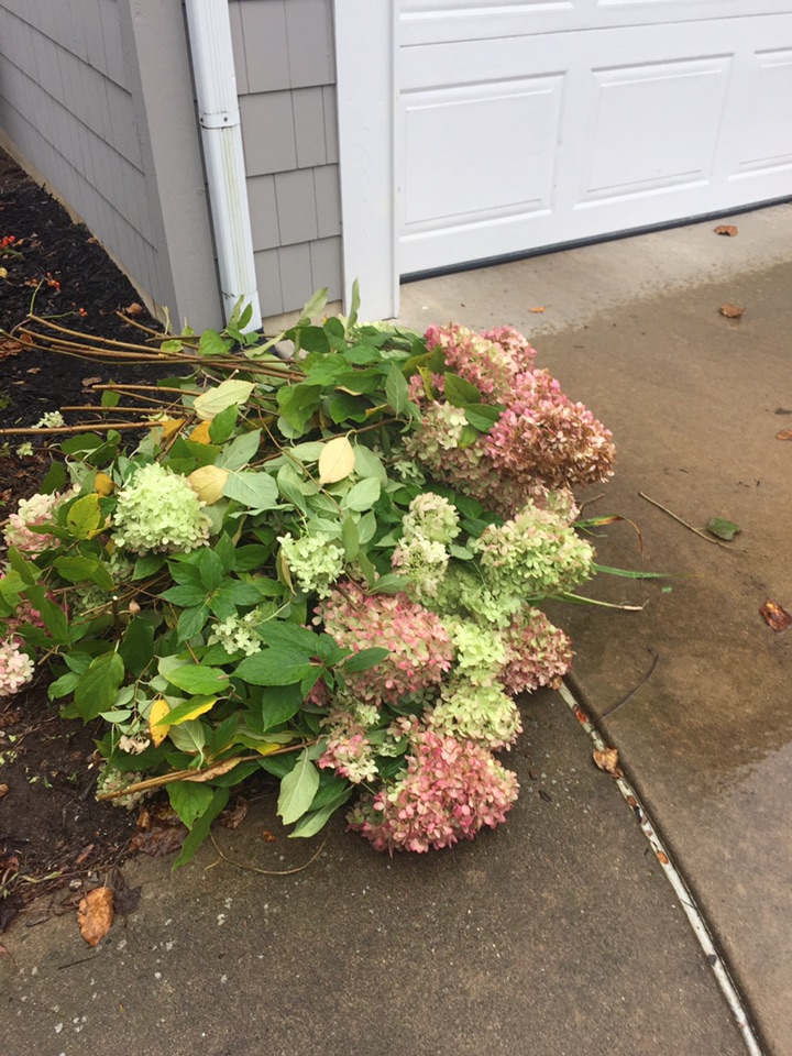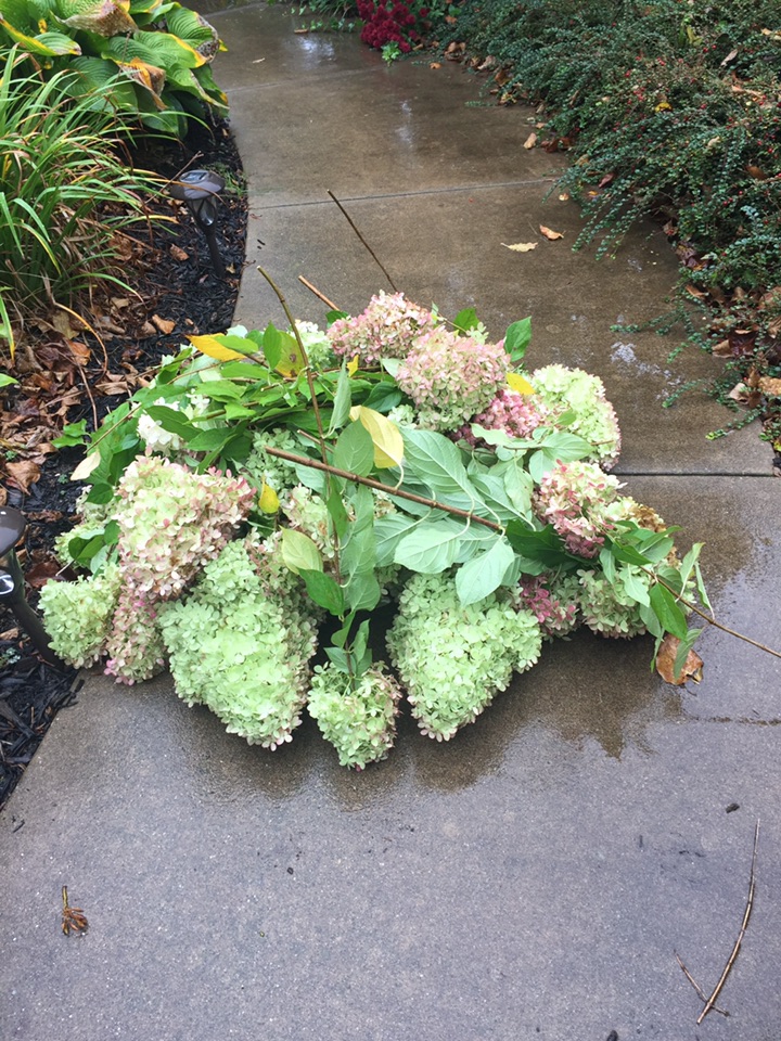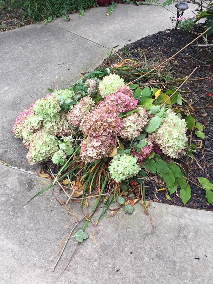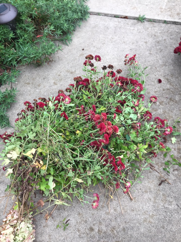 天气预报说这两天气温会下降很多、夜间最低气温将低于华氏四十度以下 所以昨天冒雨收拾了一下门前的植物 剪、剪、剪 收拾出来的花呀、叶呀、枝呀还真不少啊 好在一年一次的树叶、树枝等花园杂物收集日快到了 这些东西就有地儿扔了 顺便把一些不喜欢、长得不太好的花花草草也扔了免得明年花园里太拥挤... 忙了大半天、累不说还淋了雨 成了个泥水人 可是想着明年开春花园里的花儿们觉得一切都值了!