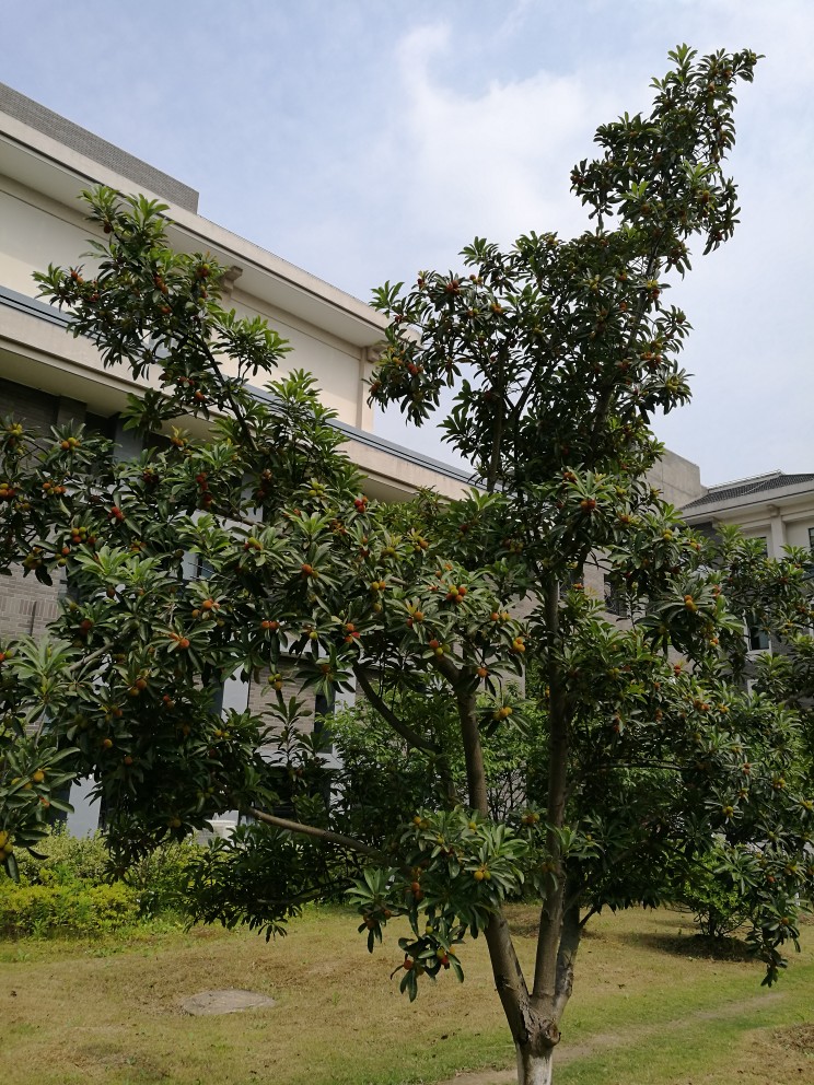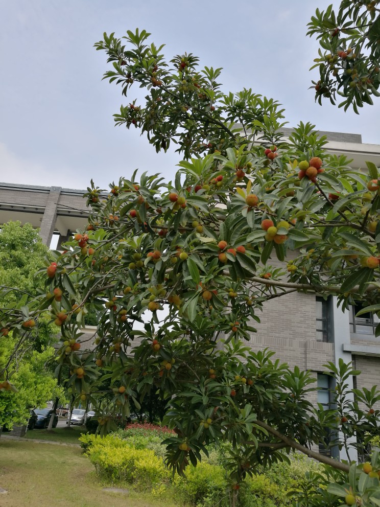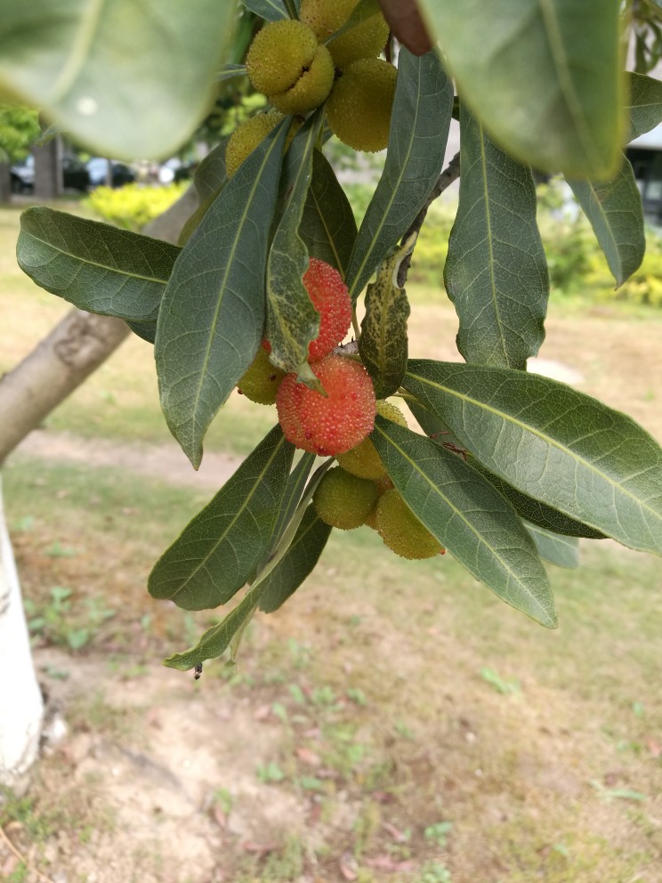六月七日,我在校园绿化带里偶然发现了已经开始变红的杨梅。