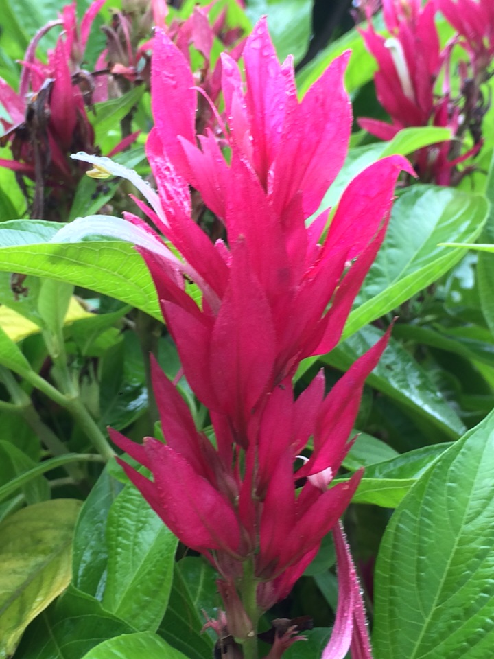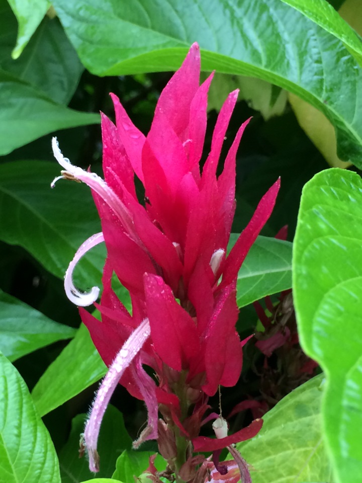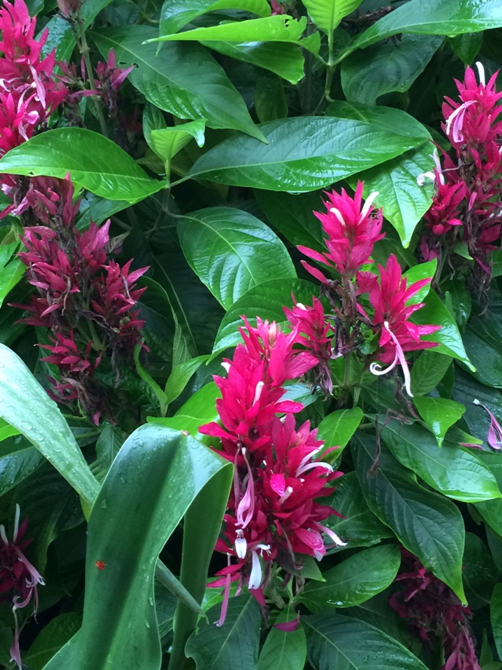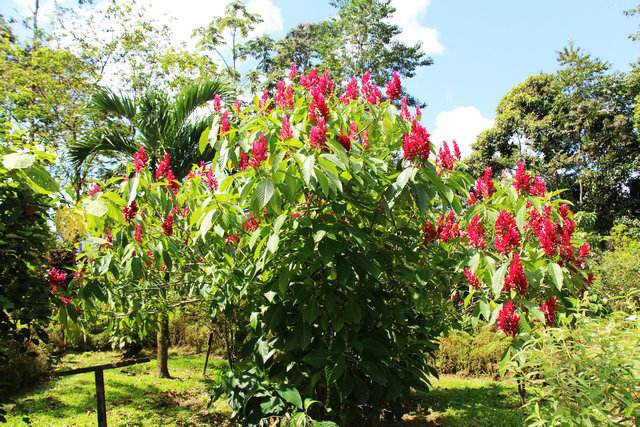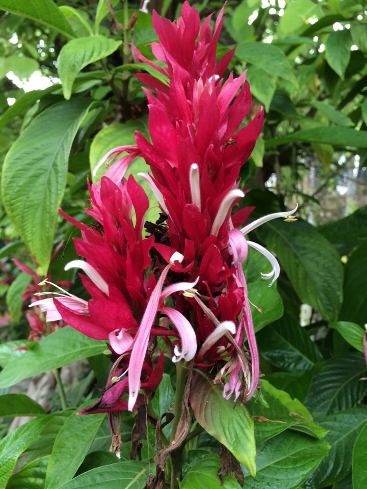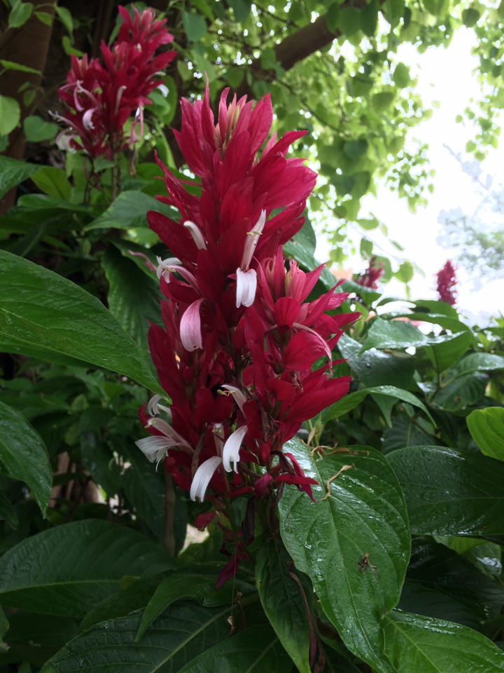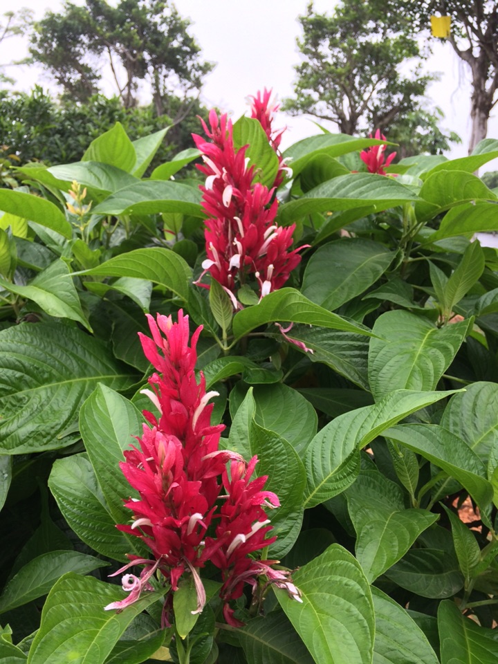 今年五月与朋友一起到南宁旅游,在南宁青秀山公园偶遇一片高大的花卉,足足有2-3米高,花序顶生,红红火火的苞片有20-30公分,看得我口瞪目呆,这么大的苞片实属罕见!堪称“巨无霸”。花冠二唇状,红和白色,白色看来容易脱落,层层叠叠的红色苞片分外艳丽。植株高大,叶片也大,单叶对生,长约30-35cm,宽10-15cm。当时认为是珊瑚花, 回家整理照片对比资料,发现错了!是爵床科赤苞花属的赤苞花。珊瑚花是爵床科珊瑚花属,植株及叶片明显比赤苞花小,且花冠无白色唇片。