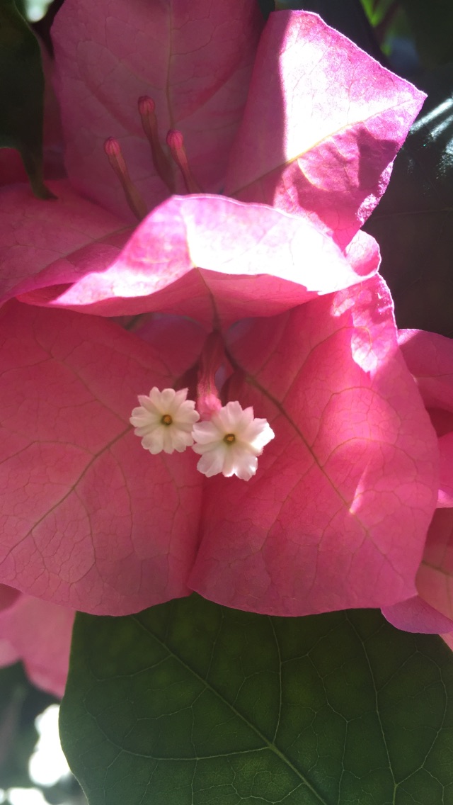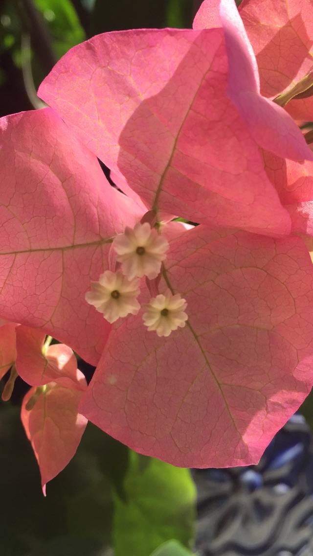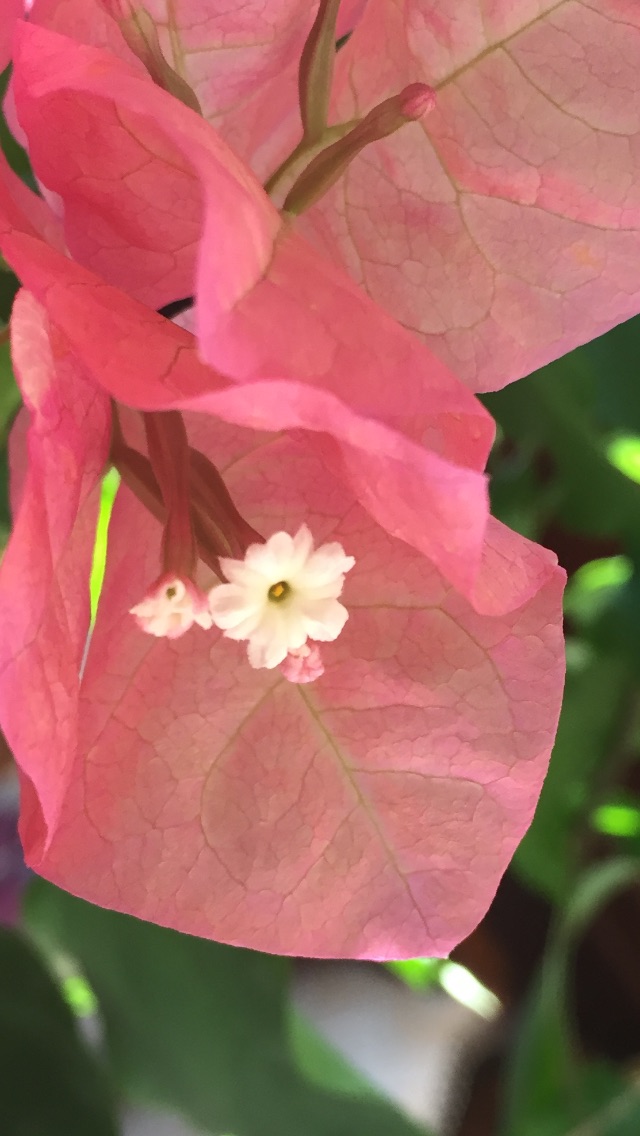 花儿很小很小 乳白色 却是很精致 只是太小了 得爬到跟前才能看见 很多人喜欢三角梅大概是喜欢其艳丽的色彩 亮粉色、紫红色、黄色及白色 以及彩色叶子簇簇点缀于翠绿的叶子中的那种丰饶、富丽堂皇之态!估计有人可能从来没注意到这叶子花的真正小花儿吧😜