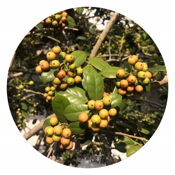无主干,基部以上开叉分枝。叶硬革质,椭圆形,全缘,叶尖为骤尖,较硬,叶面绿色,有光泽,叶互生。伞形花序,花米色。果球形,成熟后红色,直径约0.7厘米,大小一样。果经冬不调,艳丽可爱。