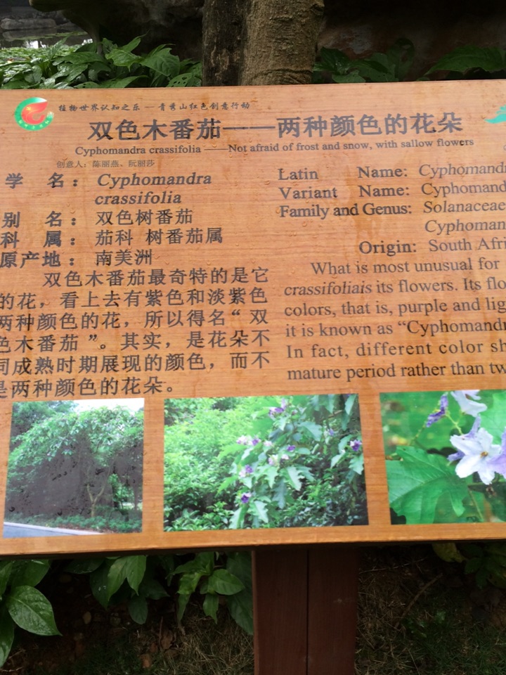 树高2-3米,奇特的是它的花看上去是紫色和淡紫色两种颜色,其实是花朵不同成熟期展现的颜色。当年种植当年即可结果,我们是五一期间去的,早了点还没结果,据说果成熟时上面挂满红红绿绿的番茄,最多的一株结果上万个!哈哈,给它打个广告:其肉质厚皮薄,口感独特,新鲜食用甜似黄桃,香如菠萝,酸甜可口,清香味美!