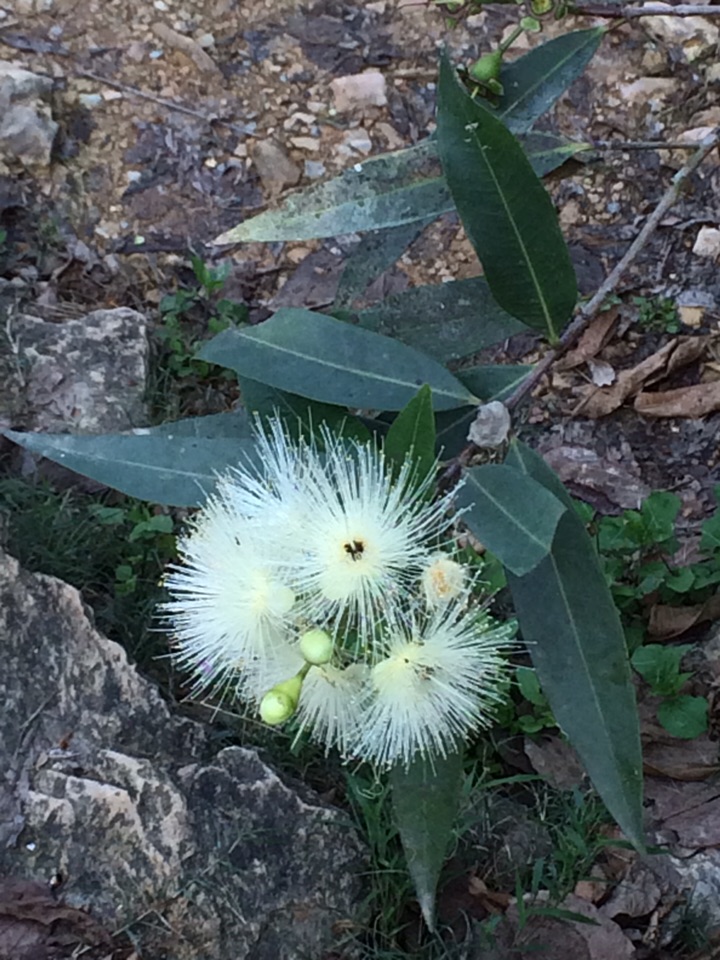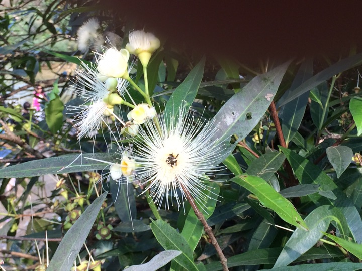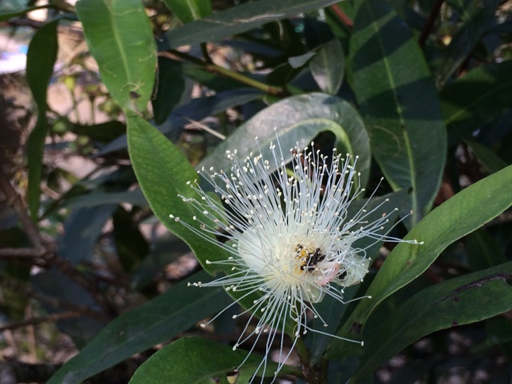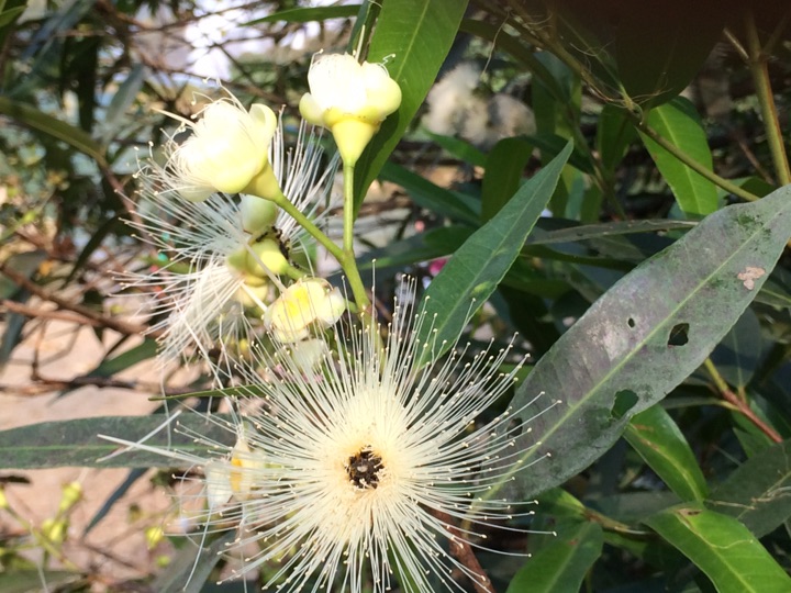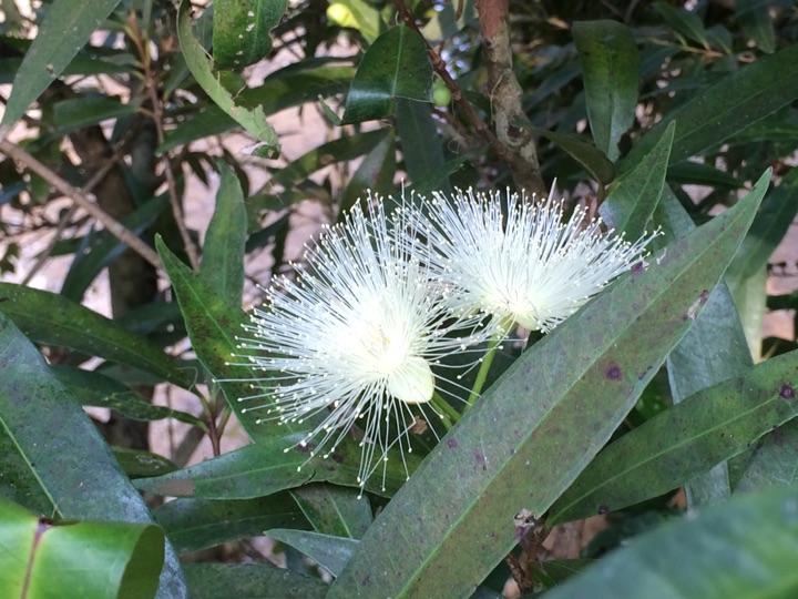 五月初在靖西偶遇蒲桃,乔木,高达十米,叶披针形,先端渐尖,聚伞花序顶生,着花数朵,白色,形如银合欢。