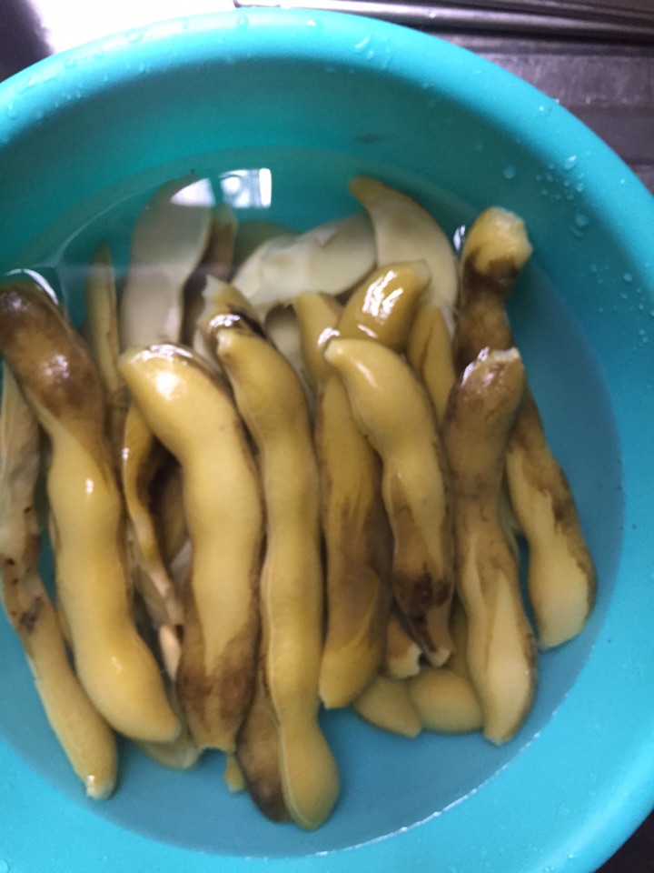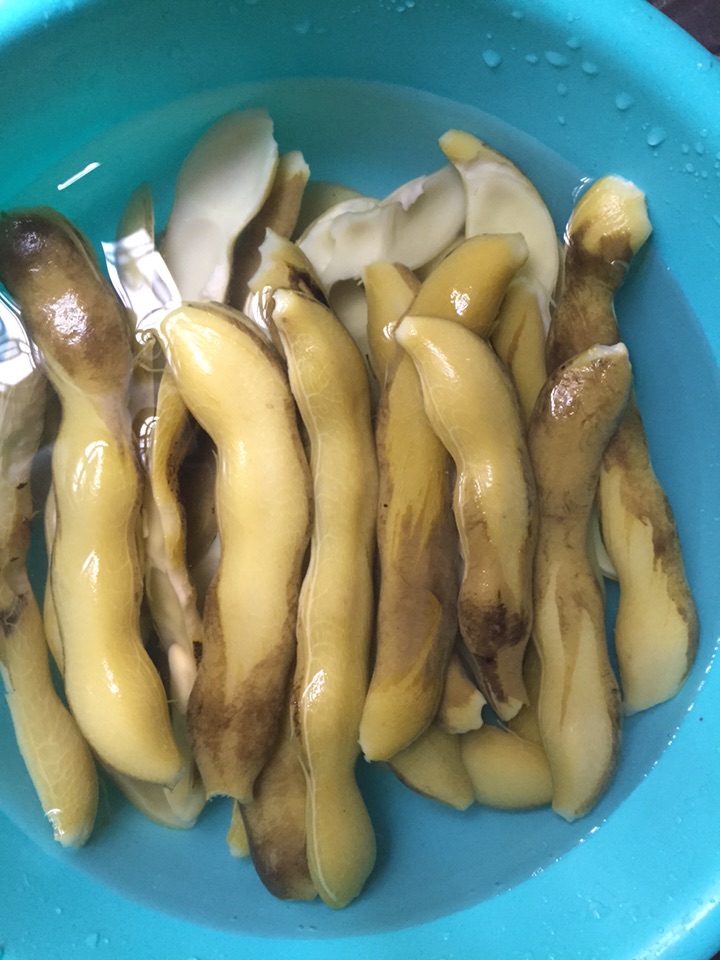以前乡人会用粗沙摩擦果皮去掉茸毛(现在多是在泡煮后直接撕去外皮),然后放在水里泡煮至表皮变软(这个很考验火候,煮久了会烂掉,煮的时间少还较硬,都不好吃),软硬适中时捞起,然后用冷水浸泡一天一夜,中间要换4~5次水。