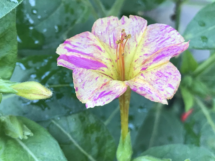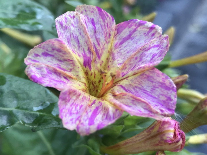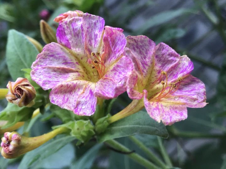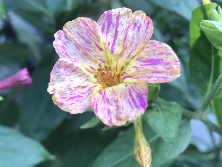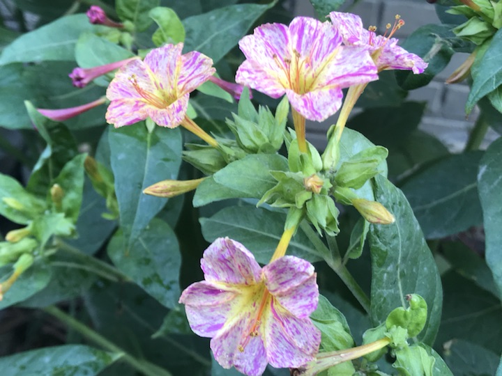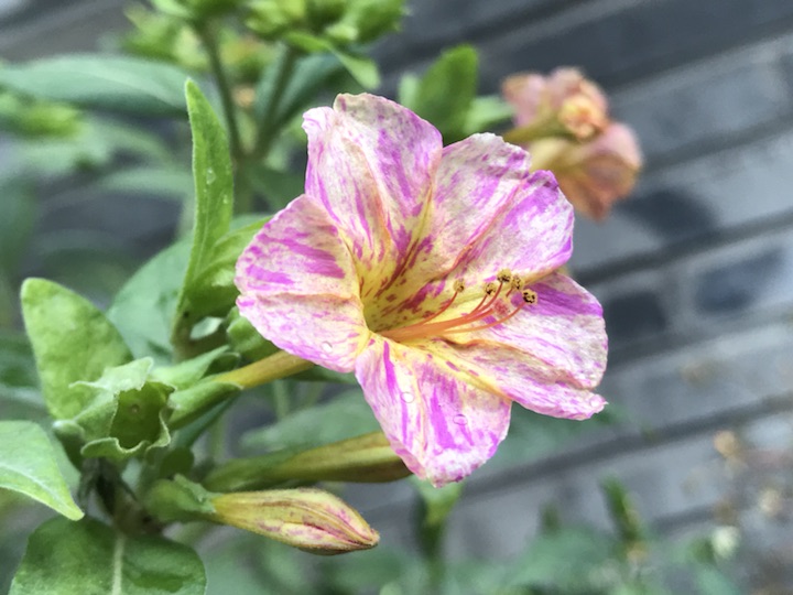同样是那株花开三色的紫茉莉,现在还开的挺好,只是三色已经不明显了,黄色的蜕变成了这个样子,另外的红已经没有了,只看到很多紫红的小花摇曳在寒风中