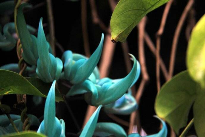 碧玉藤的花两性,春季至初夏开花,蓝绿色,形似鸟爪,多朵小花成簇聚集在一起,组成长达90-150厘米或更长的下垂的总状花序,极为壮观。它的花是很独特的蓝绿色,这在植物界几乎是独一无二的,花悬挂于茂密的叶丛中,看上去就像发出冷光一样,极其迷人。非常漂亮。