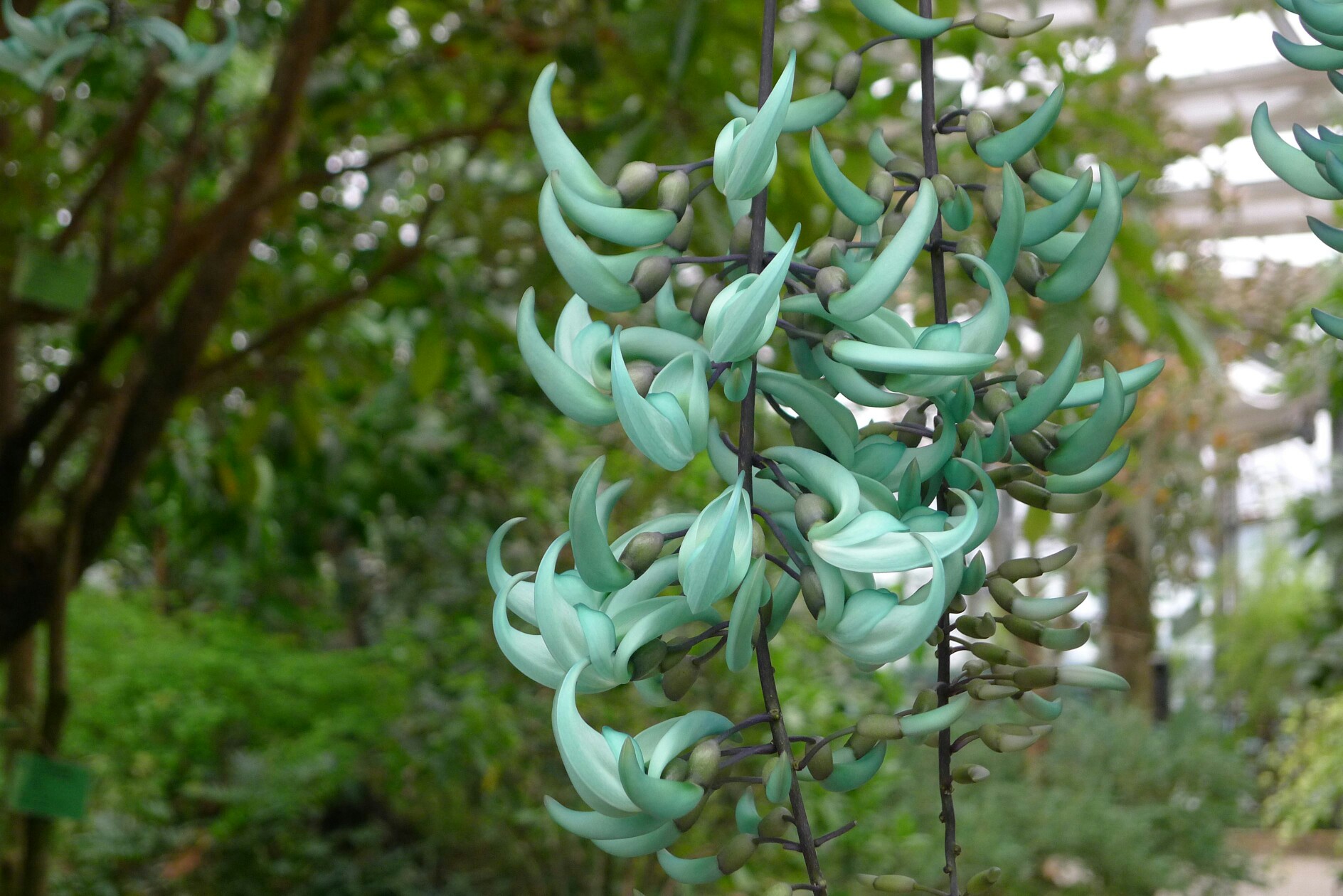 碧玉藤是它常叫的名字,原名翡翠葛(Strongylodon macrobotrys A. Gray)。和禾雀花为同属植物。