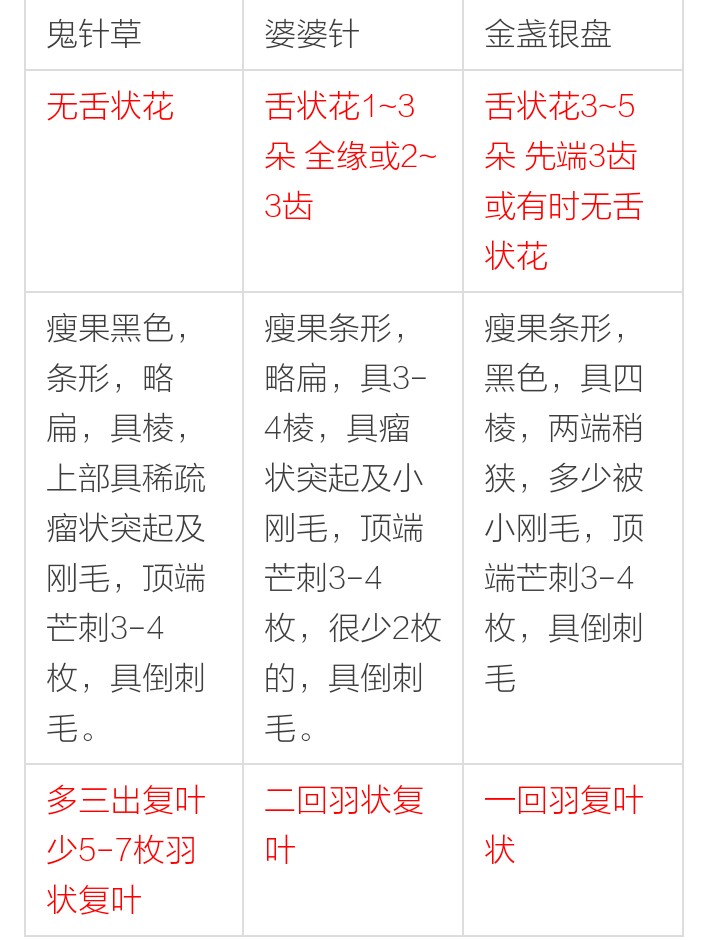 婆婆针(Bidens bipinnata L.)和鬼针草(Bidens pilosa L.)都是菊科鬼针草属的植物,不过两者差距相对来说还是比较大的。其实金盏银盘与婆婆针更像哦!