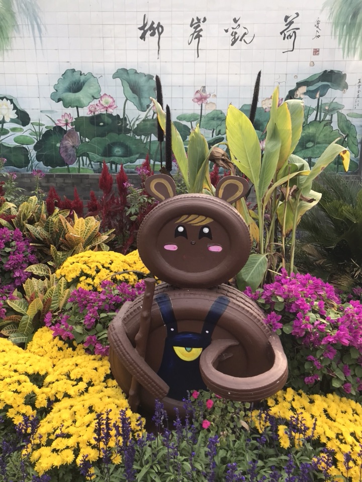生态家园:以旧轮胎造景,美化环境,废物利用,同时提高人们的环保意识,倡导低碳生活。花坛高约1米,占地面积约100平米