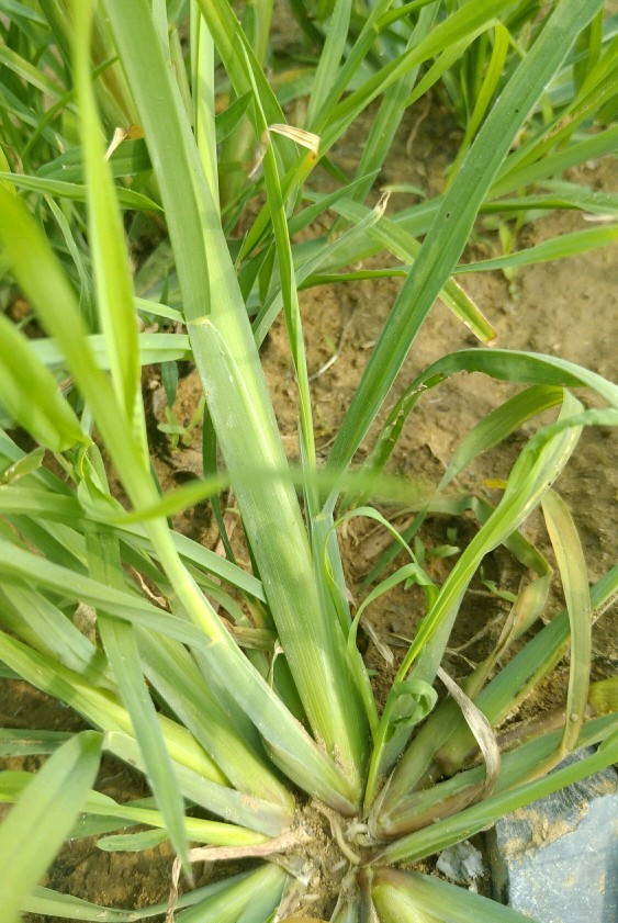 生长期时靠下的茎叶大多泛着紫色,苗时茎叶更服贴于地,茎鞘扁包裹的紧。牛筋草小棵时全草也会长得有些圆,整株看上去叶绿茎白,茎叶有些偏圆,叶鞘有些松,这两种草长大茎会斜立直立。马唐茎细举着花穗总有点吃力。