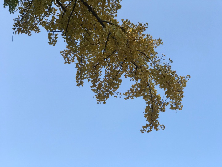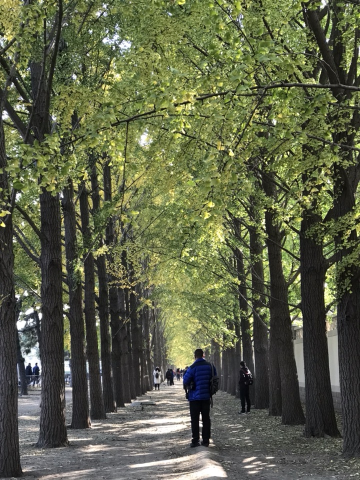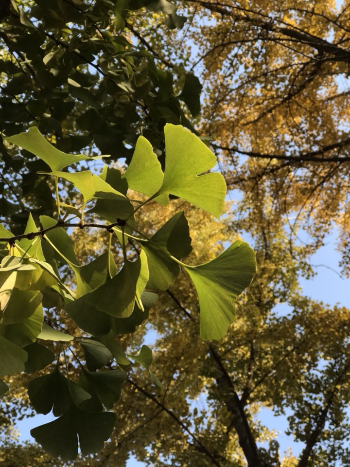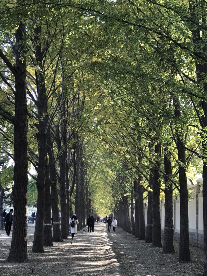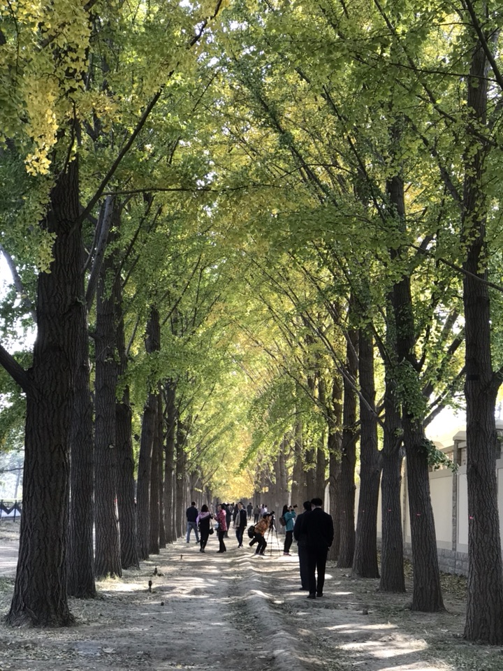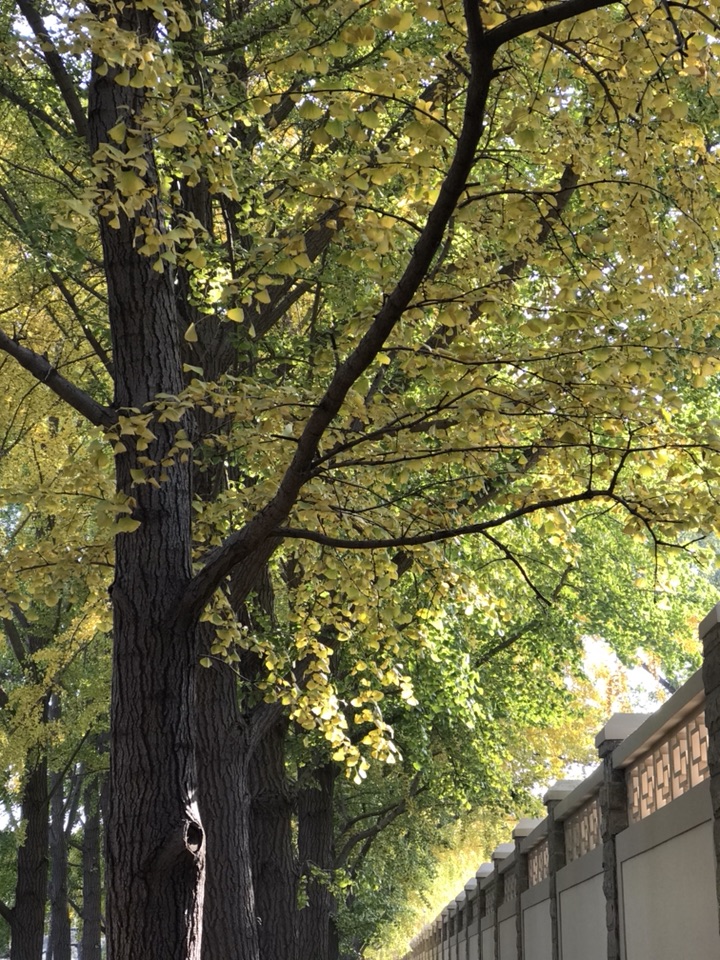 早在10天前就计划着去银杏大道走走了,后来吧由于刮风其实更多的还是由于自己的惰性一直没去成。中午的阳光很暖,也没有风,看着门口光秃秃的白蜡树我在犹豫要不要去银杏大道溜一圈呢!万一叶子掉光光了岂不白跑一趟?后来一想去吧,掉光了就掉光了吧,旁边不是还有个玉渊潭公园嘛,大不了又逛公园去!才刚走过玉渊潭公园,便看到那一排排高大的银杏树,以及树底下那一堆堆的人。出乎我的意料这个季节的银杏叶多半还没有黄,走在银杏林里,眼前是一片青黄相接的银杏叶再加上阳光透过叶的缝隙洒下点点斑驳给人满满的夏日感。随处可见的赏叶游人、有浪漫的情侣,举着长镜头的“拍客”,支起画板的“画客”,欢笑的孩子们,还有一对拍摄婚纱照的夫妻,跟这林中的喜鹊一般叽叽喳喳增添无限的热闹情怀。这样的情景,其实并不是我乐意见到的,如果只有我一人或者再加上那么三五游人岂不更好?什么景观人一多了,便觉得失了景观的本色索然无味了