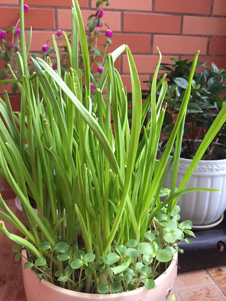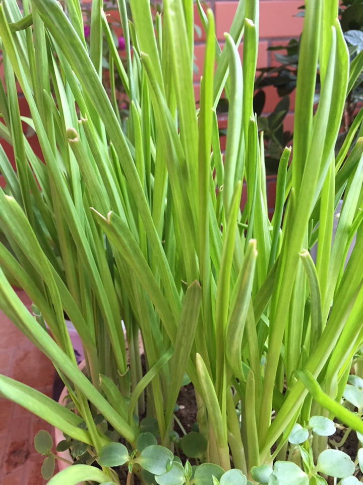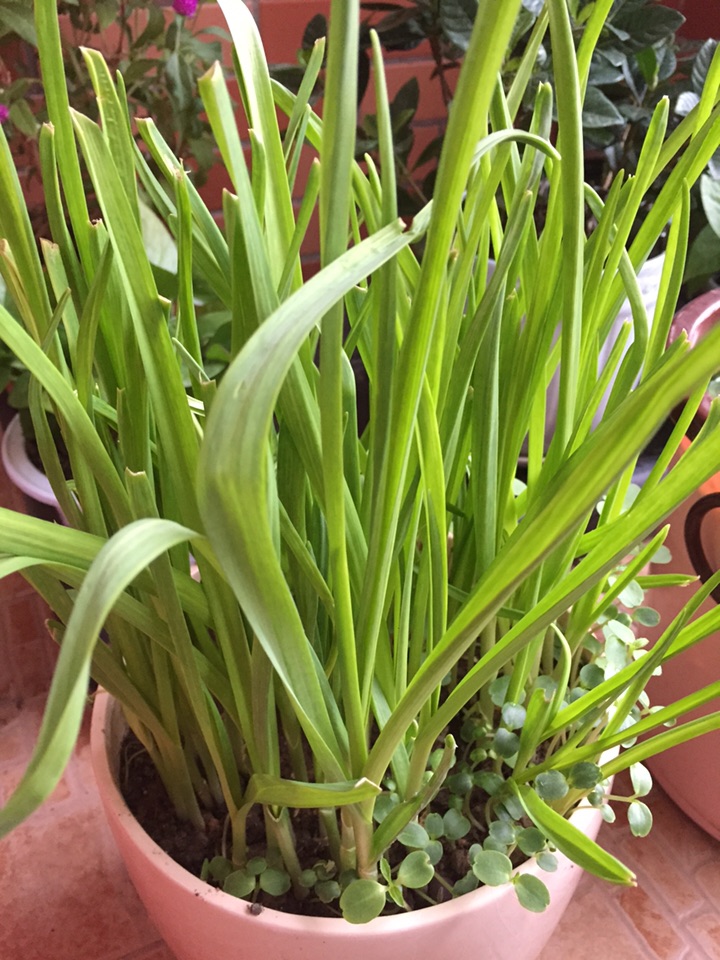 今周回来,它给了我一个惊喜。蒜苗已长得好高,颇有水仙之姿。嗯,可以摘下来焖豆腐了。😄