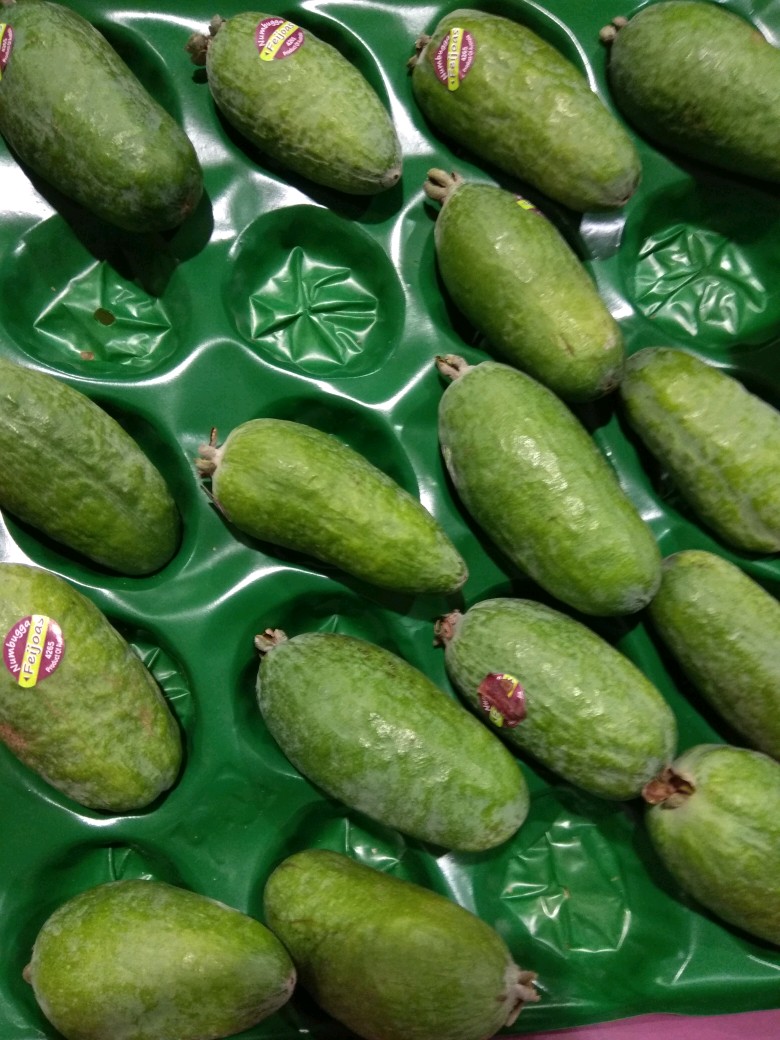菲油果/斐济果(Feijoa sellowianaBerg),桃金娘科菲油果属常绿灌木或小乔木,又名费约果、凤榴、肥吉果、菠萝番石榴。原产地在中南美洲,盛产于新西兰。果实外皮深绿色,富含维生素C。