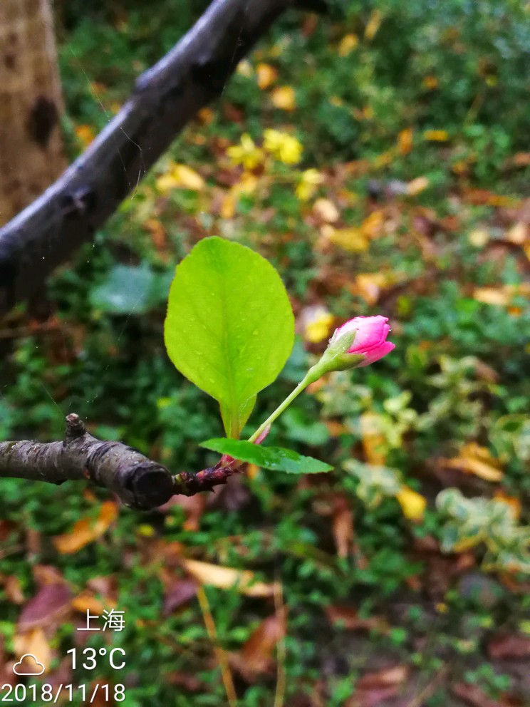 好在不是春天那般热烈奔放灿烂地开,零星开而已。不过,突然想起来,去年深秋在植物园看到的,却是开得很全面的垂丝海棠花。