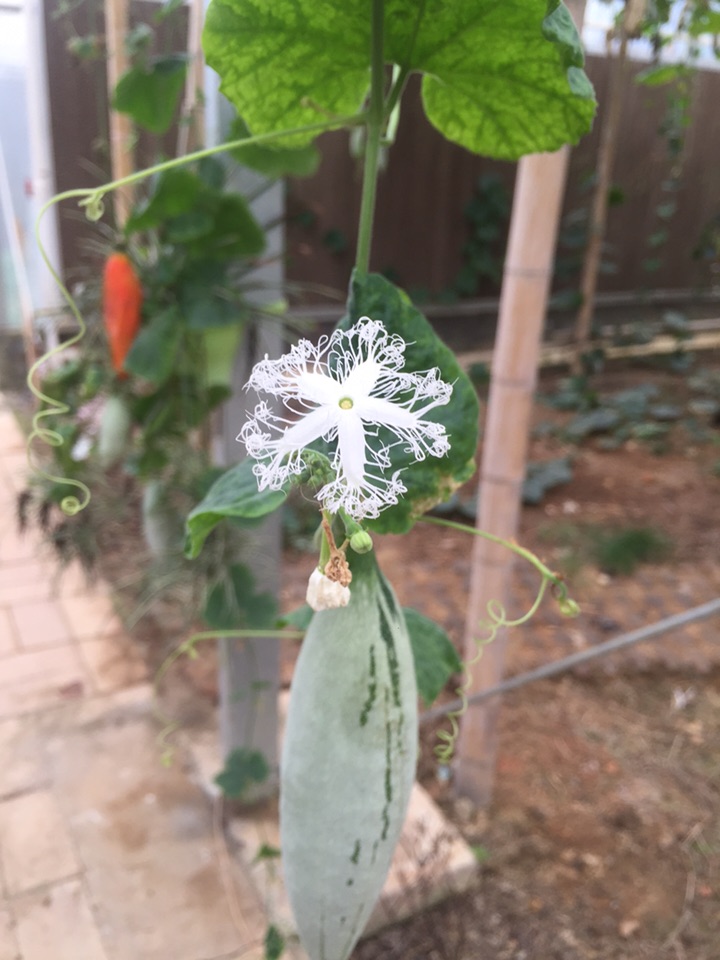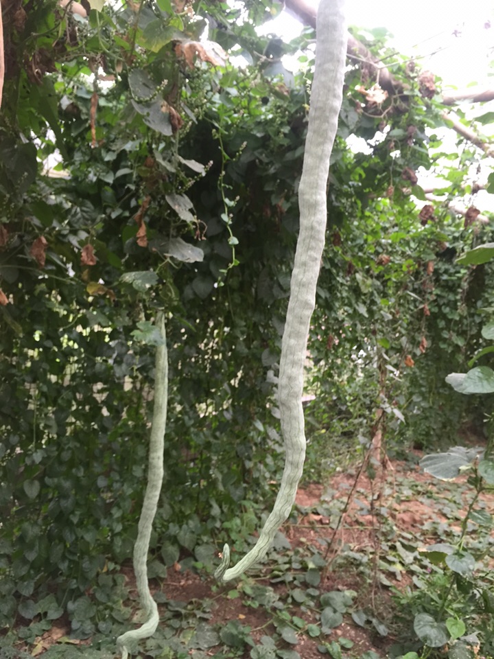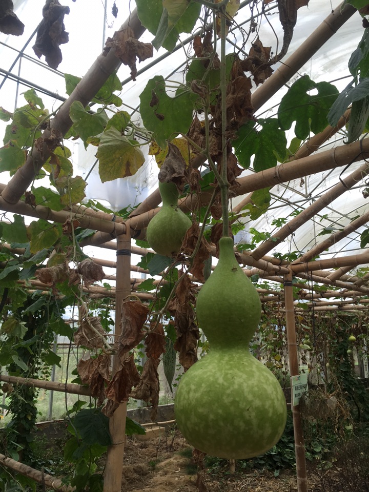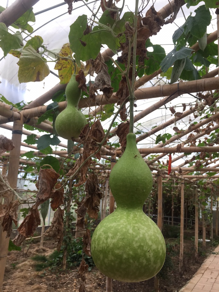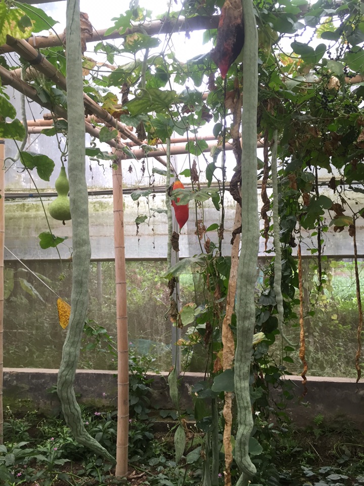 穿行郊区,看到各类瓜果藤蔓已枯萎,但仍有果实挂在架子上。