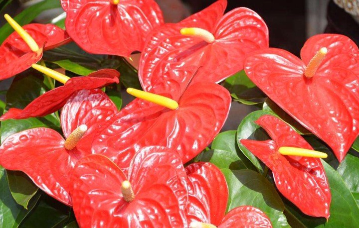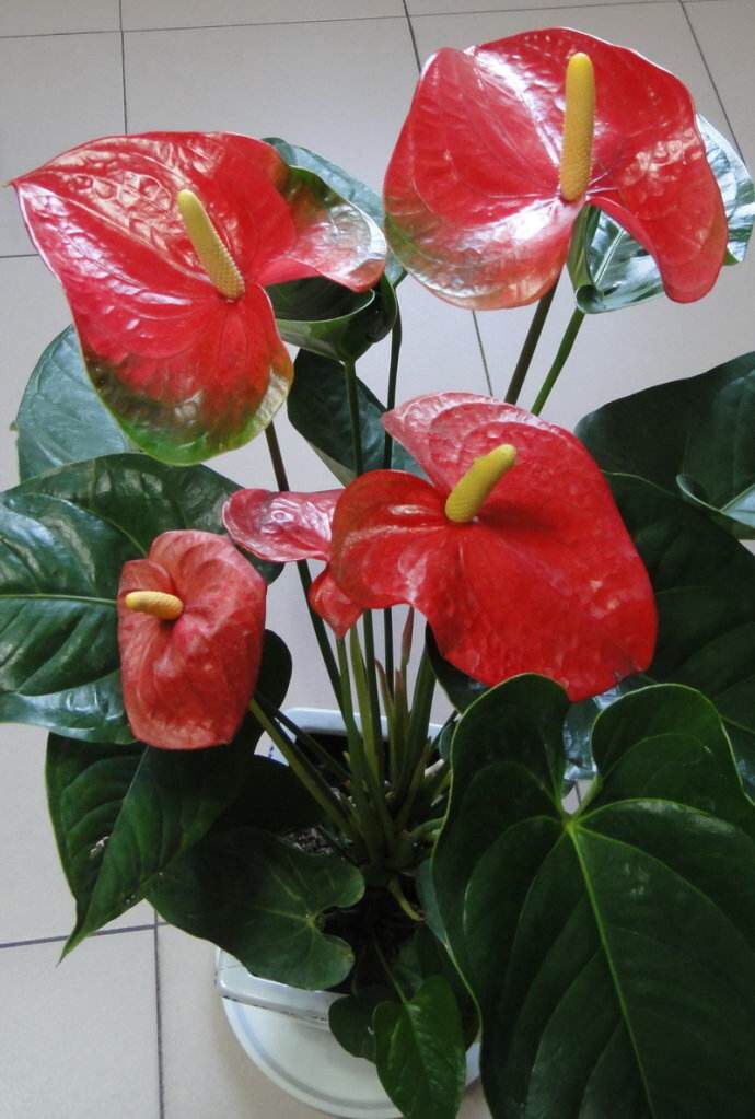 红掌又名花烛、安祖花,能吸收苯、三氯乙稀等有害气体,有效率达80%以上,有很好的净化空气作用。