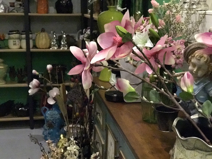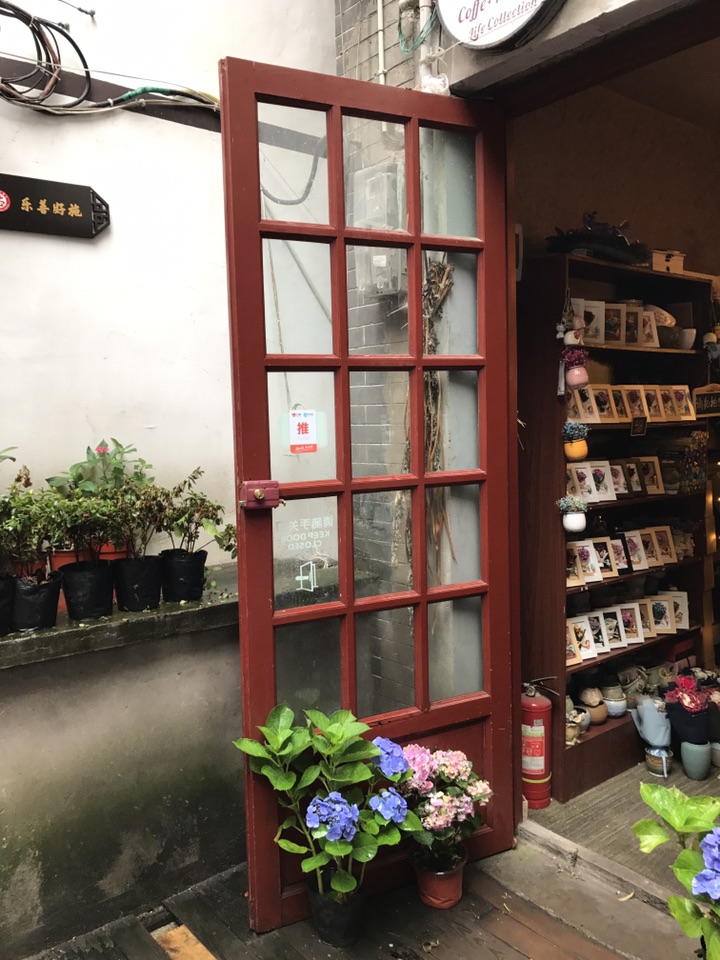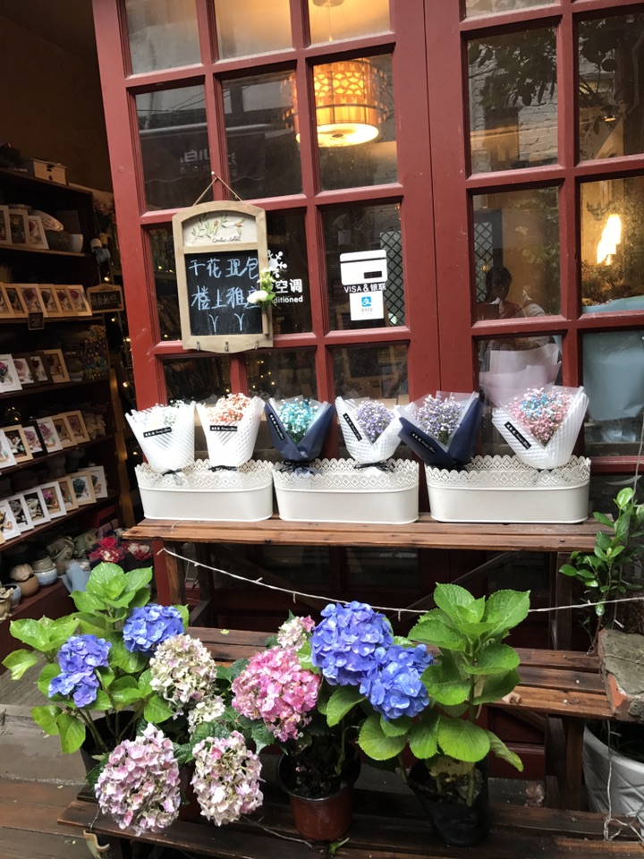 这些花的摆放,花盆的搭配,植物跟商品的选择当然都还有进步的空间,甚至垂挂下来的还有塑料花,但不是已经有了吗就可以进步。