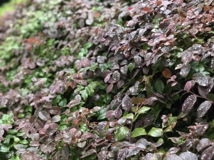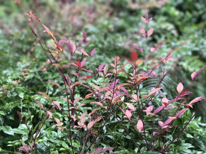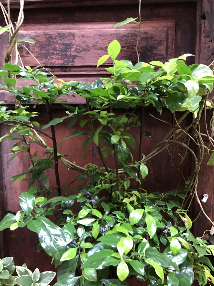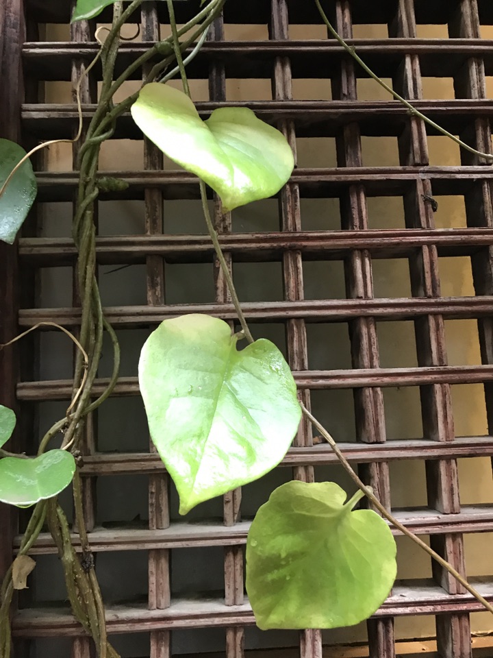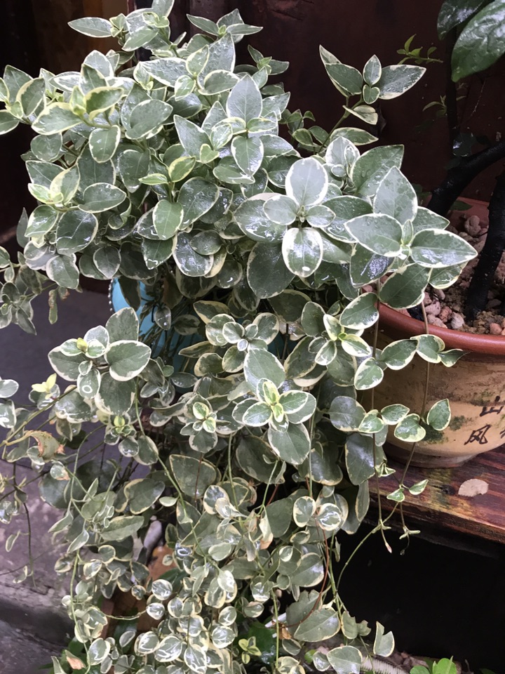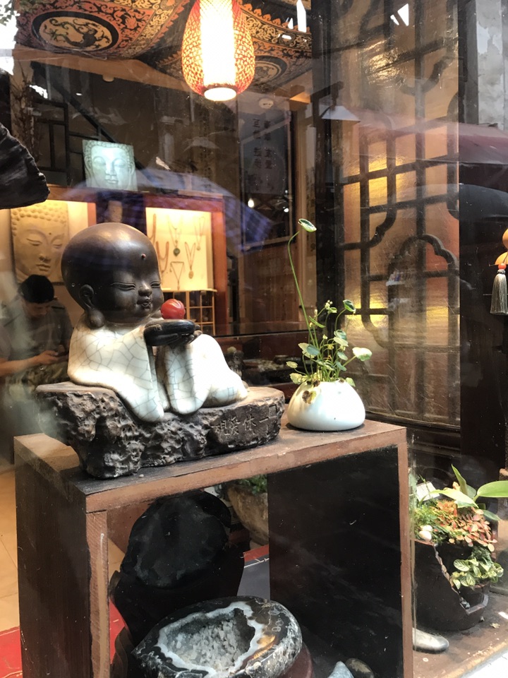 更安逸的是,不少店面,开始莳花艺草。不想过去一下,巴不得把自己那点肠肠肚肚都显示出来。绣球盛放,竹枝摇曳,侧柏葱葱,还有肾蕨,绿萝,鸳鸯茉莉,花叶蔓长春花和萼距花长势喜人。野田七和蓖麻飞叉野道的,虽不算规矩的花,也有生意!小叶榕,彩带花,黄金菊,海桐,铜钱草搭配的是一个小雕塑,在橱窗里也值一观。