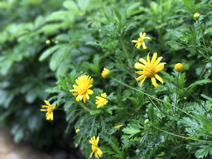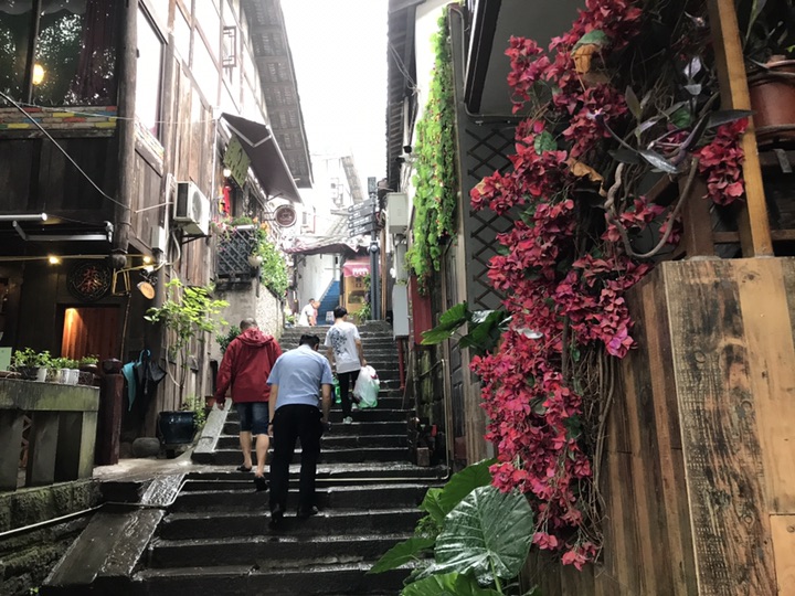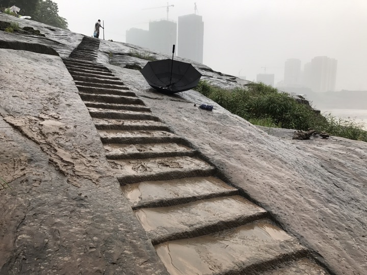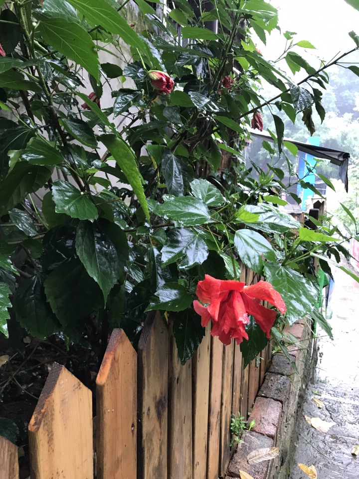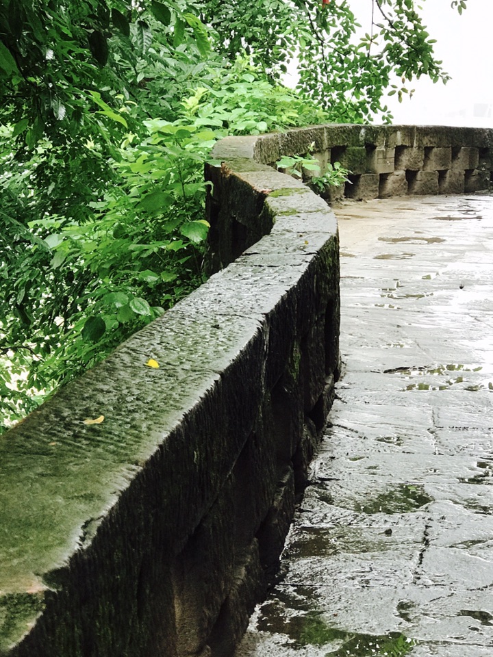 单纯从颜值来看,野生花卉当然不及人工的,老旧的城墙,弯曲的栏杆,垂挂下去的榕树和苦楝数,都可加分。往江边走,光滑宽大的石头插入江里,旁边是水观音,不知谁种下的紫茉莉,石头上凿出来的台阶,都好看。只是下雨,游人很少,但是拍照更相宜。