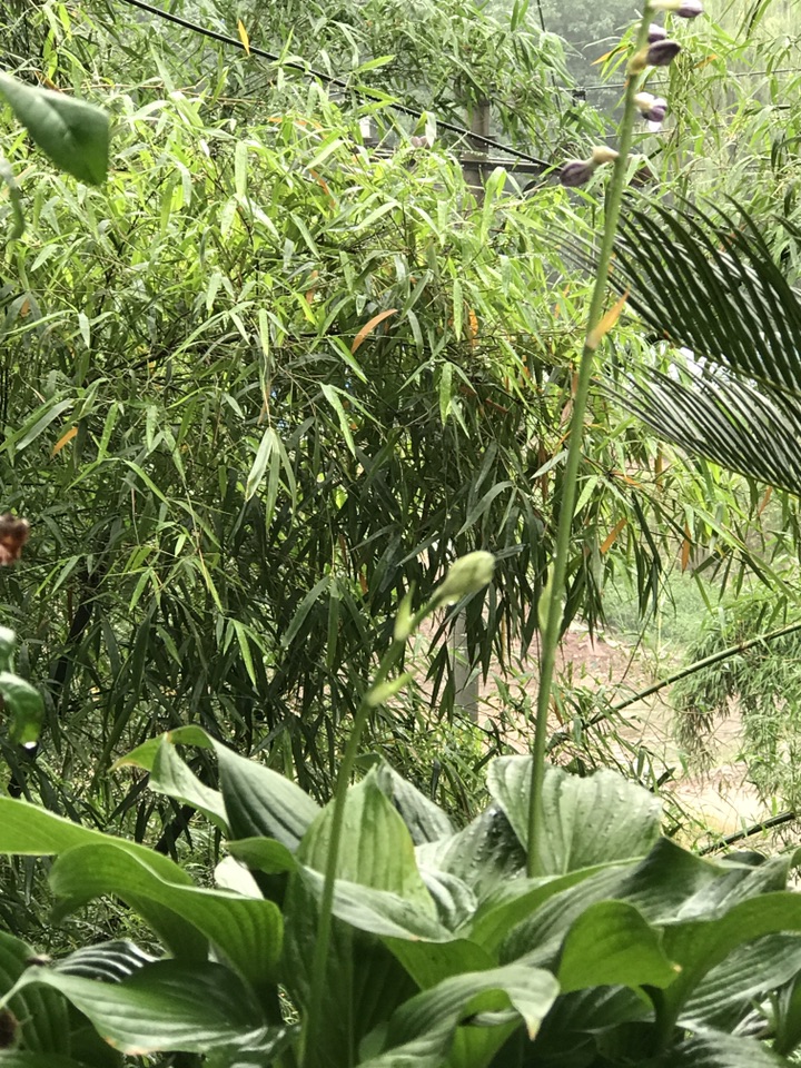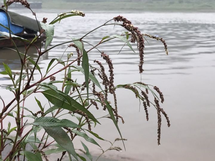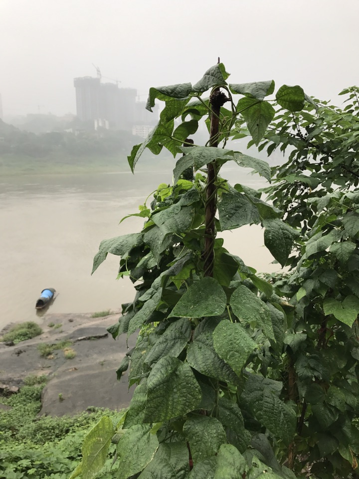 往江边走,栽培的花草少些了,但是也有红色的扶桑花,白色的栀子花,紫色的玉簪花,绿色的爬藤。野生的原麻,竹子。农民种的菜豆,也在开花,也在结果,蒲尔根黄色的花已经从春天开到了夏天,辛苦了!