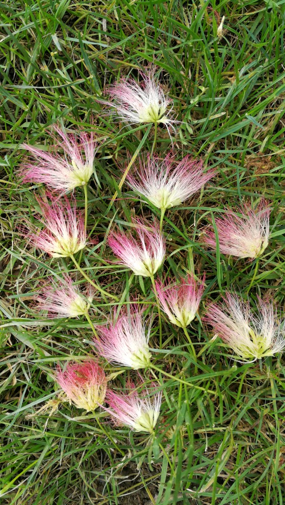 今天也注意到了开花的合欢树,树太高拍照够不到,捡几朵花放草地拍一下。