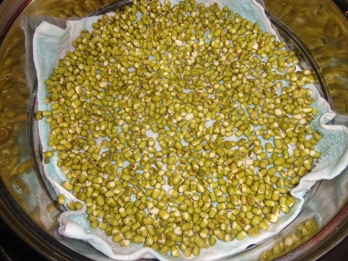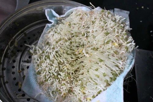 准备一个蒸架,在下面辅上一块稍厚点的有吸水性的毛巾;把绿豆均已的排布在上面