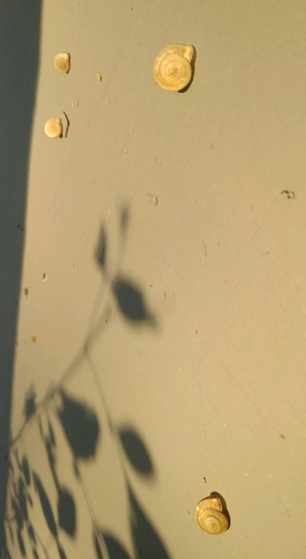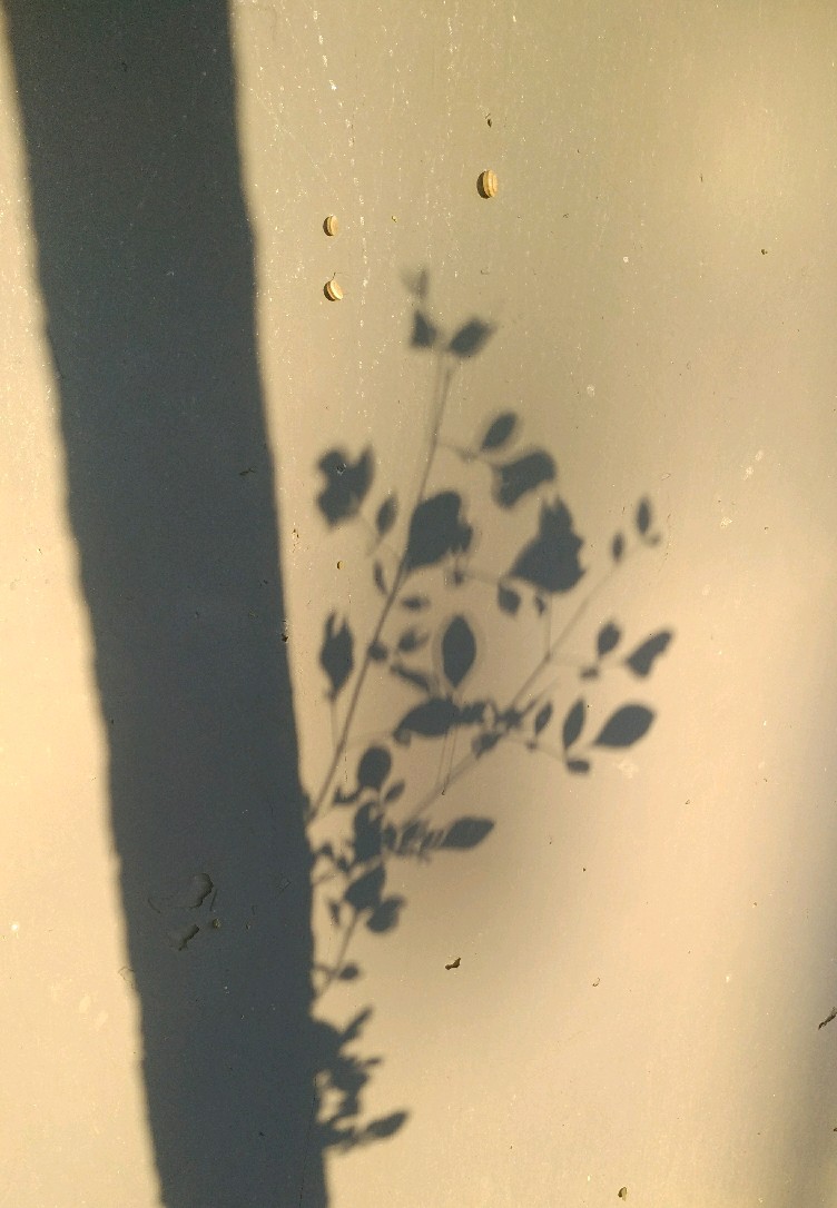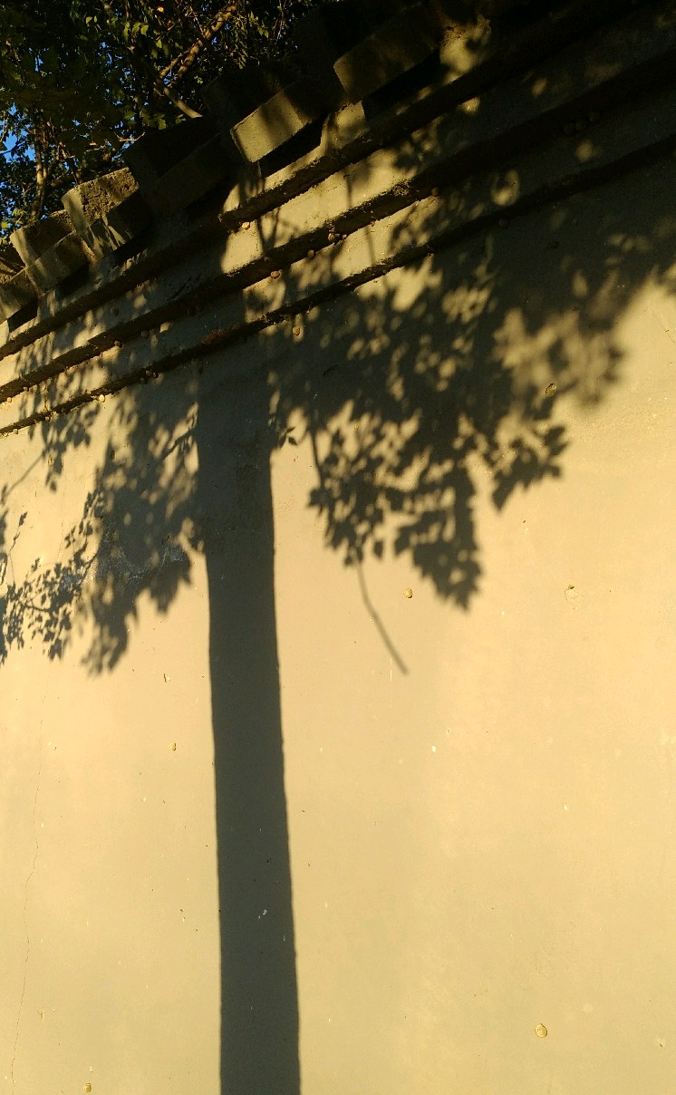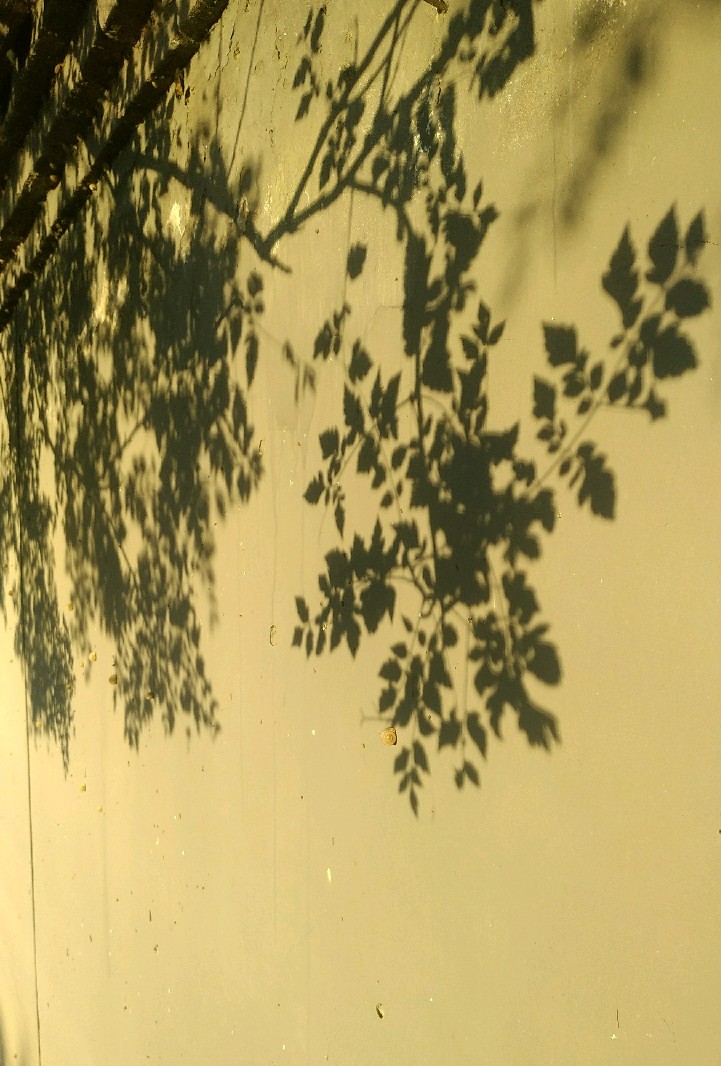 9月底,经过那几棵栾树时,斜阳刚好把栾树的影子画在墙上,上面还布满了蜗牛壳,画儿一样,拍的时候发现自己的影子也在上面,那就和栾树合个影吧!真像老照片。
