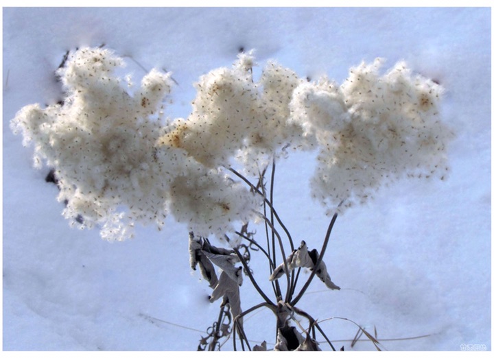 小孩子好玩,经常用手捏山棉花的果实,细腻柔软,然后鼓起腮帮子吹一口气,白绒绒,轻飘飘的山棉花种子毛就飞扬起来,与雪色融为一体。