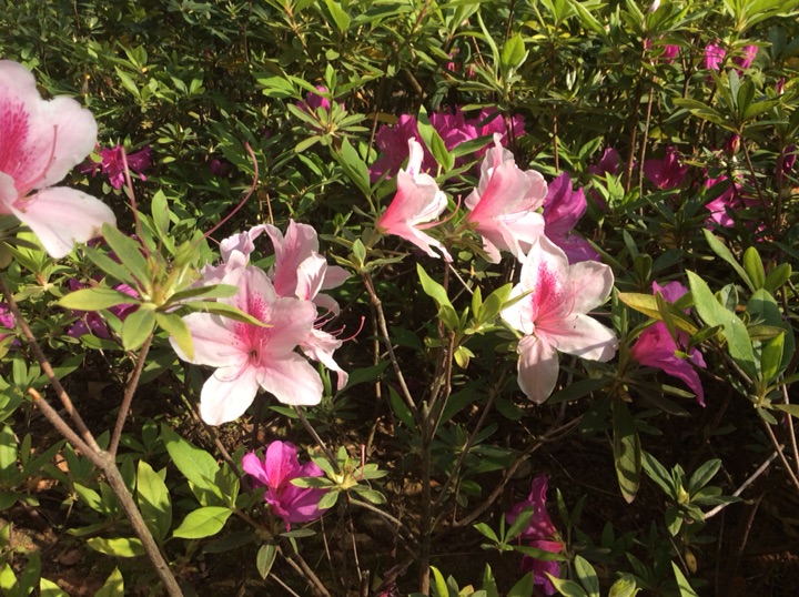 春天 杜娟花盛开了,粉嫩的颜色混在了一起,小小的叶子长在枝头。