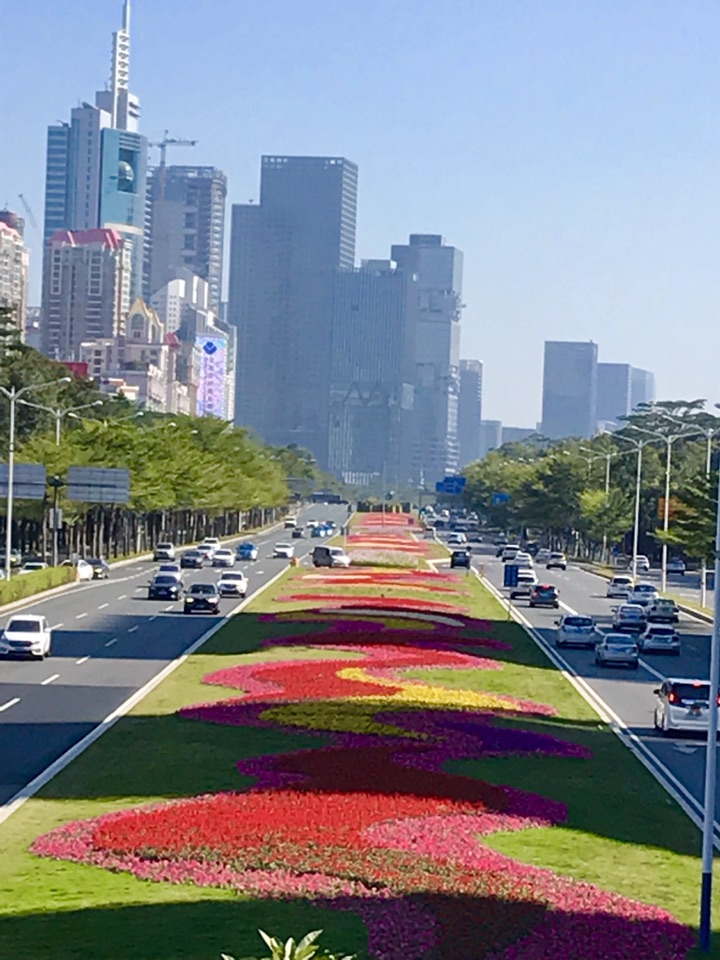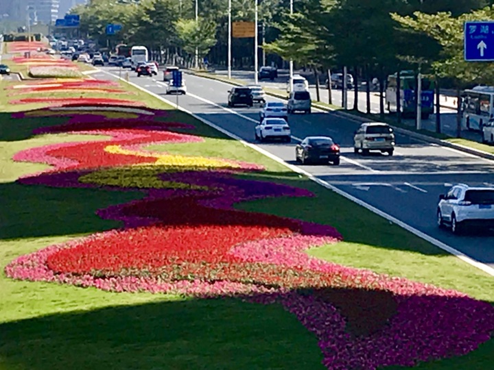 花扮大道,陽高懸,光耀動,影垂地,好顏慰路人。
