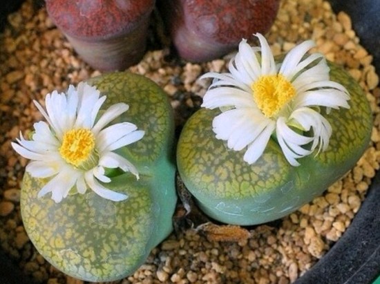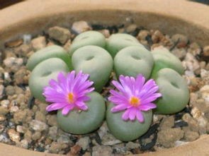 它的品种很多很多,开的花色也很多很多,它的叶子是和茎连在一起的。生石花跟所有植物长大的方式不一样。其他植物都是长高,落叶才代表他长大了。但是生石花就不一样,生石花是像蛇一样蜕皮生长的。他在蜕皮的时候不能人为的给它拽掉。要不然会出大事儿的。接下来咱们介绍他的花。他的花分为很多颜色,有黄色的,白色的,紫色的。