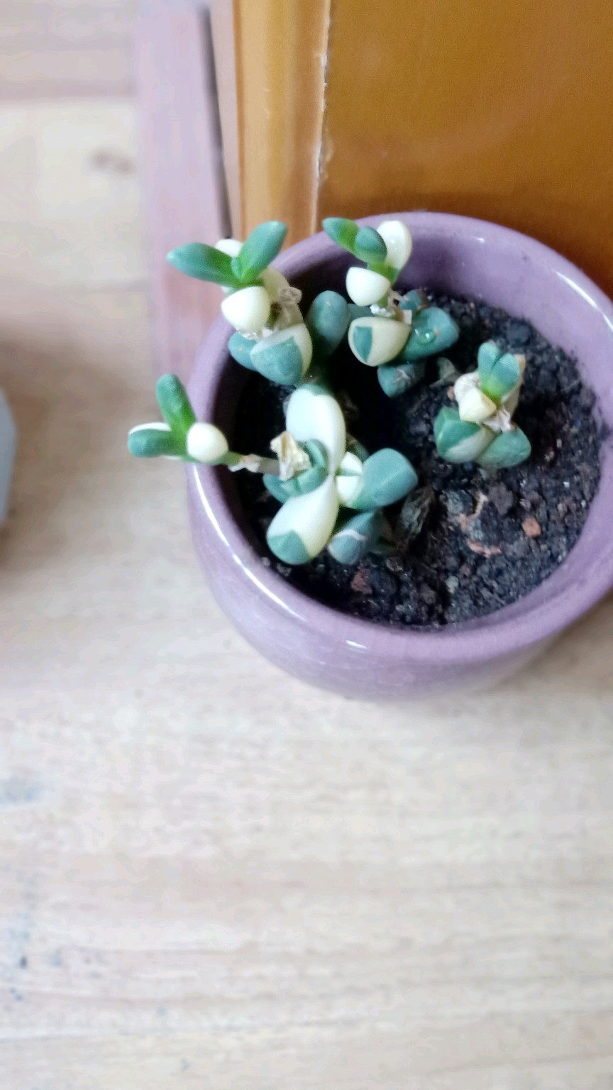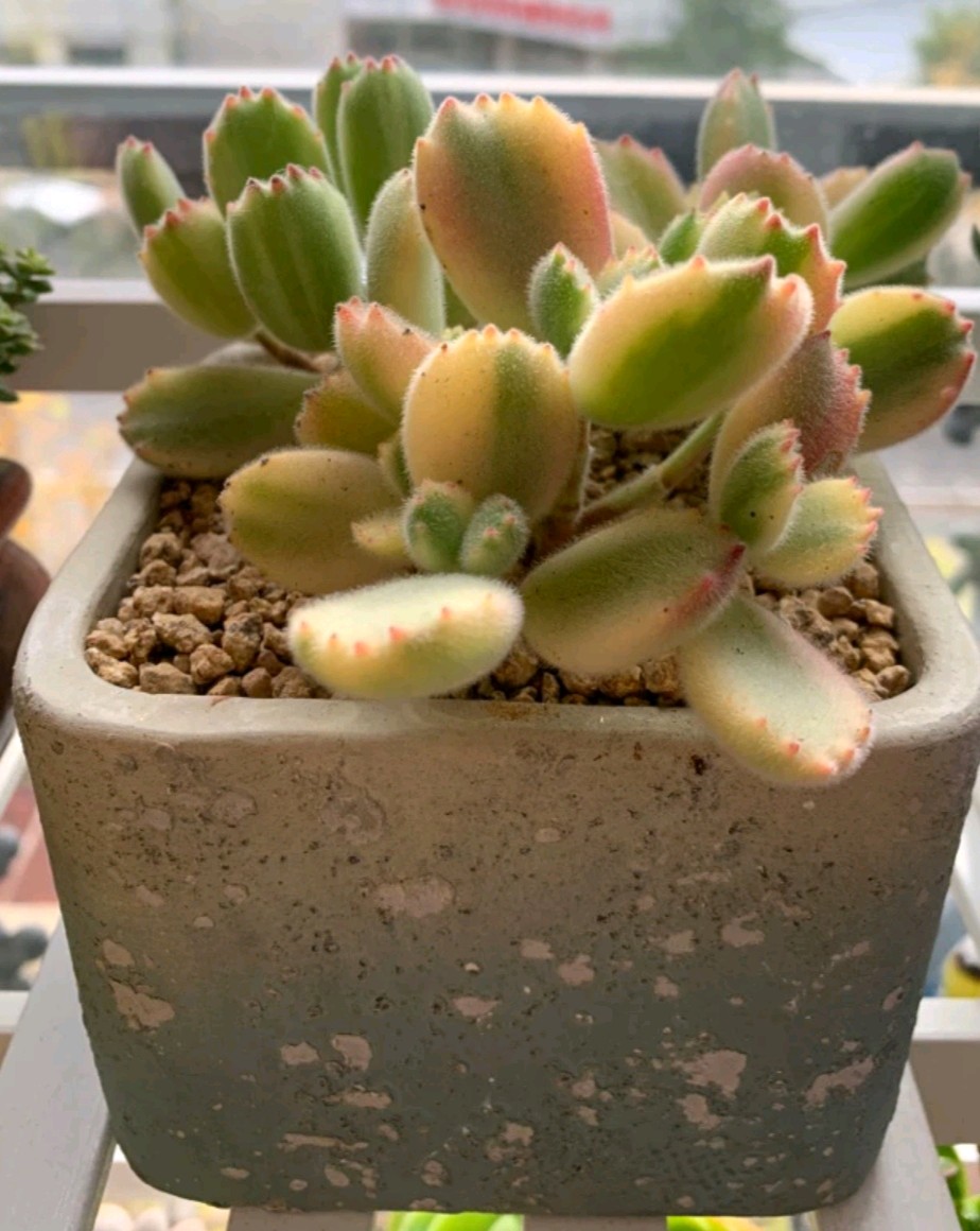 熊童子白锦的叶子和熊童子是一样的,熊童子白锦就是熊童子出锦了。样子就是普通熊童子的叶子上长了几道白色条纹而已。它的锦有时候可能是晒太阳晒多了就变成粉色。