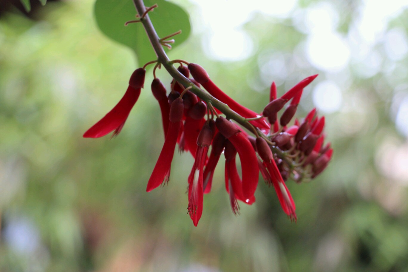 龙牙花红叶扶疏,初夏开花,深红色的总状花序好似一串红色月牙,艳丽夺目。