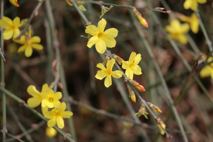 迎春花属落叶灌木,丛生,枝条下垂。花单生在去年生的枝条上,先于叶开放,有清香,金黄色,外染红晕,花期2-4月。因其在百花之中开花最早,花后即迎来百花齐放的春天而得名。