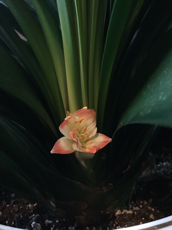 昨晚意外地发现君子兰又开花了 似乎不像往常那样先有长长的的花剑、花蕾而是直接开出一朵花、低低的靠近根部 颜色也和上次开时不一样 淡了许多 乳白色的花瓣点缀着粉橙的花边 粉嫩、粉嫩的 和年初开花时很不一样呢!而且只有这一朵花独自绽放 何尝不是一种孤影形单之美😜