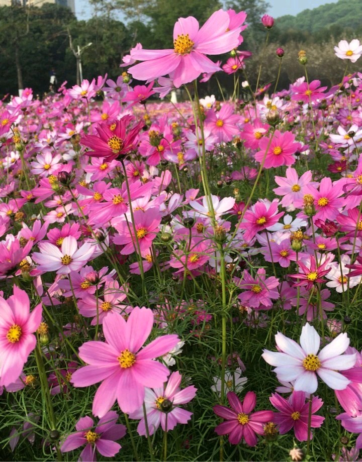 波斯菊(学名:Cosmos bipinnataCav.),别名:大波斯菊、秋英。一年生或多年生草本,高1-2米。根纺锤状,多须根,或近茎基部有不定根。茎无毛或稍被柔毛。叶二次羽状深裂,裂片线形或丝状线形。头状花序单生,径3-6厘米。总苞片外层披针形或线状披针形,近革质,淡绿色,具深紫色条纹。舌状花紫红色,粉红色或白色;舌片椭圆状倒卵形,长2-3厘米,宽1.2-1.8厘米,有3-5钝齿;管状花黄色,长6-8毫米,管部短,上部圆柱形,有披针状裂片。瘦果黑紫色,无毛,上端具长喙,有2-3尖刺。花期6-8月,果期9-10月。 此著名的观赏植物原产美洲墨西哥,中国栽培甚广,在路旁、田埂、溪岸也常自生。云南、四川西部有大面积归化,海拔可达2700米。