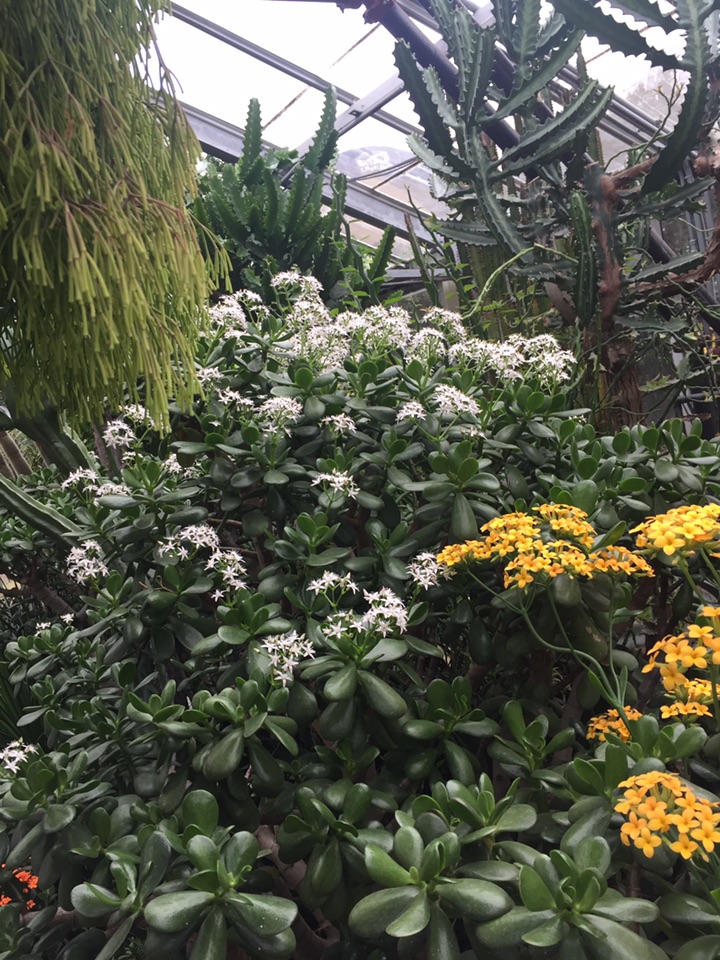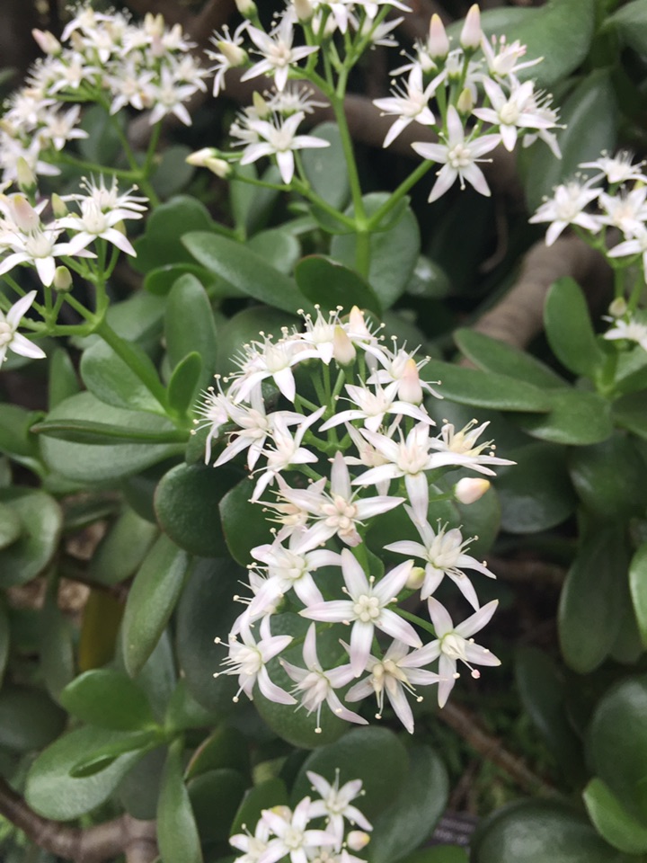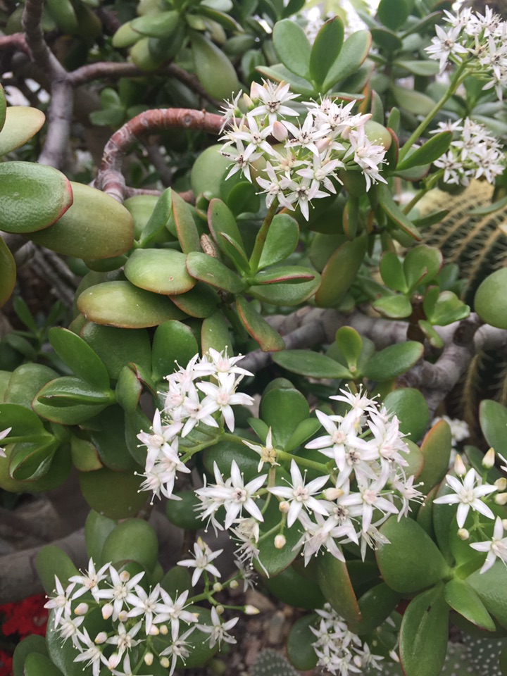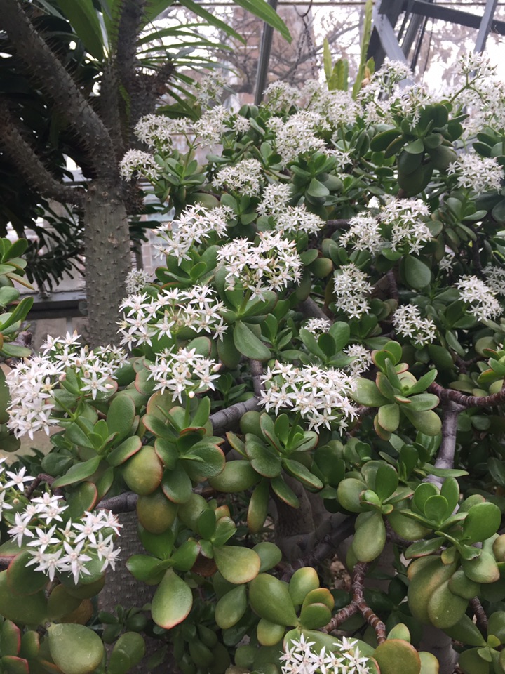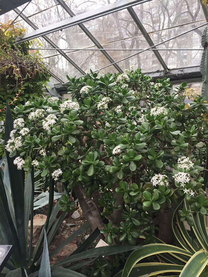 玉树很常见 也曾经在家里种过 可是玉树开花却是第一次看到!原来玉树开花可以这么好看、每一朵都秀丽、剔透玲珑 让人忍不驻足观赏!这个植物园里有大概八九株玉树 培育得都很健壮 株株都在花期 花朵或多或少、各具风姿 给冬日里的植物园增添了许多花意、清新