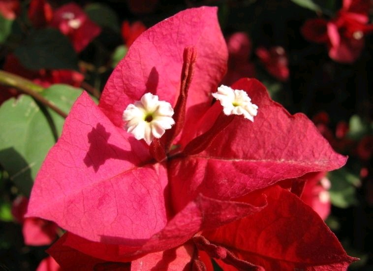 叶子花最美的地方在她的苞片上,它的苞片形状像是叶子,但又有着与之不同的颜色和质感。