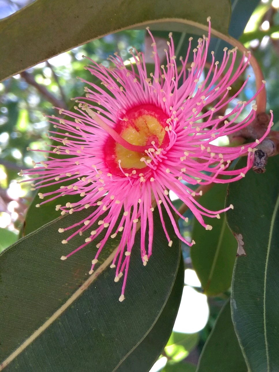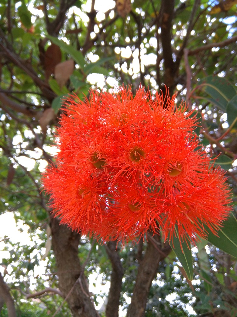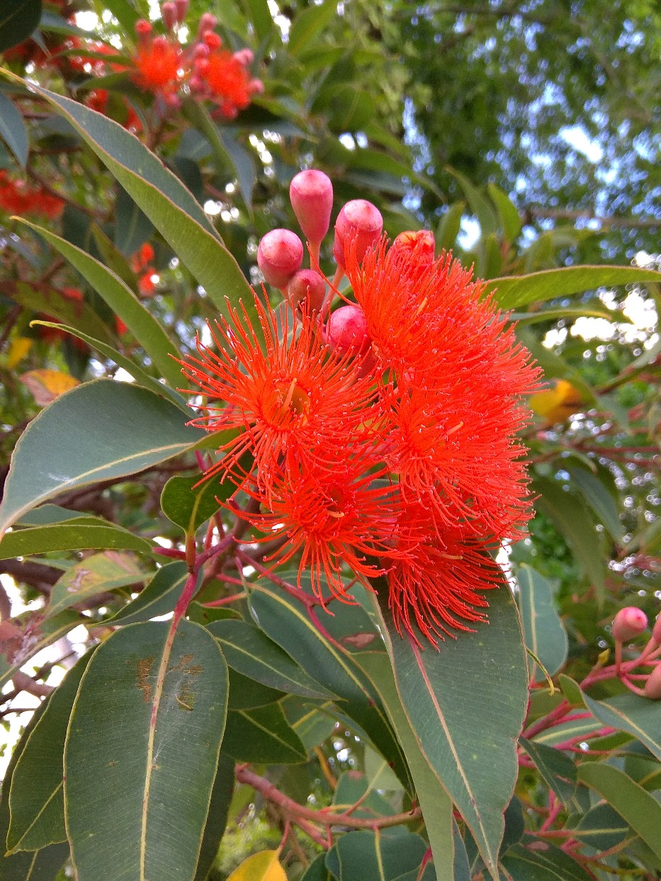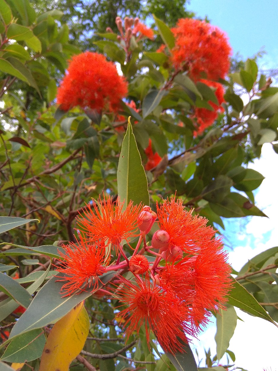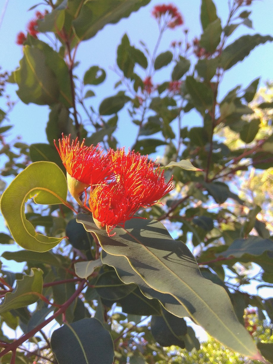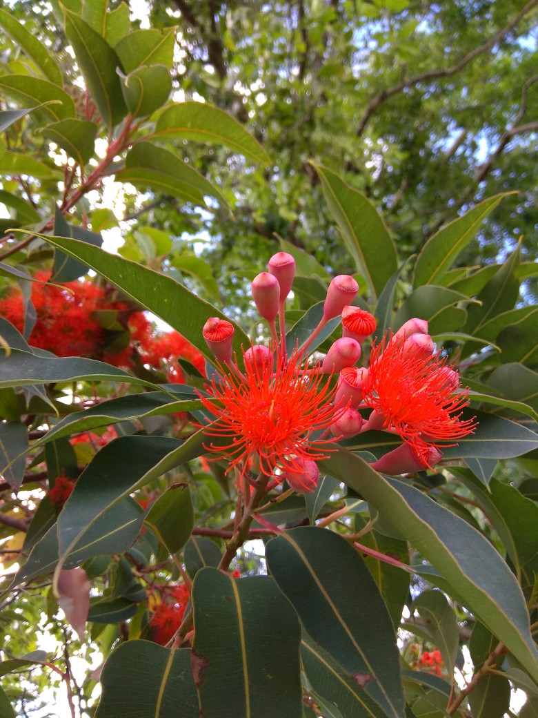 红花桉的花朵,颜色有多种。今年的压轴发现了,应是这金鱼红色红花桉了。这花色虽不常见,却能一下子就留意到,因这色最早