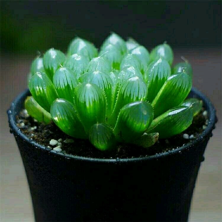 姬玉露:多年生草本植物。植株无茎,初为单生,后逐渐群生状。呈紧凑莲座状排列。叶高度肉质,肥厚柔软,两侧圆凸,舟形,先端肥大星圆头状;叶翠绿色,顶端呈透明或半透明状,俗称“窗”,其表面有蓝绿色线状脉纹,叶尖有细小的丝状须。总状花序,小花白色,有绿色纵条纹。👇️👇️👇️