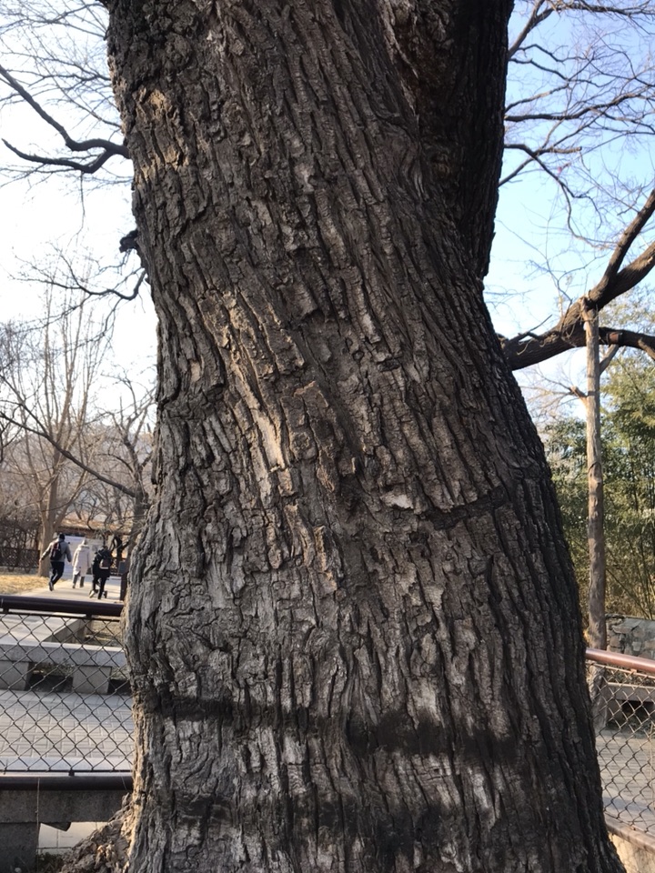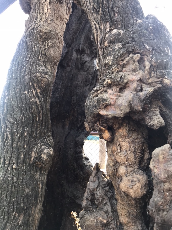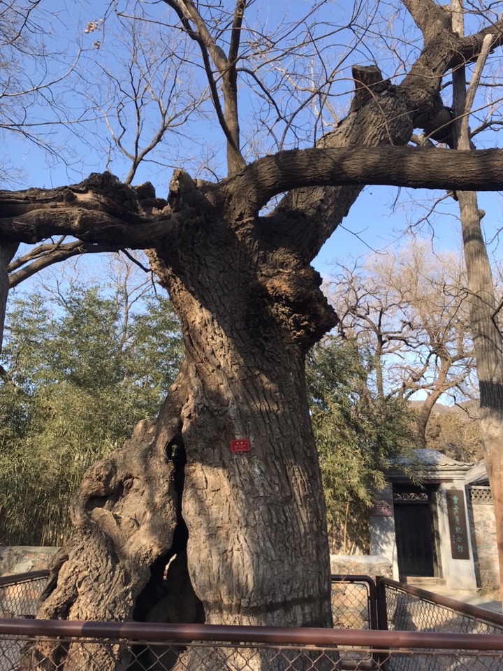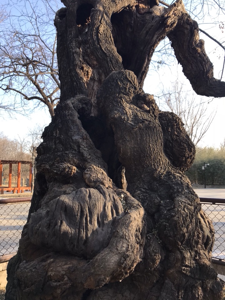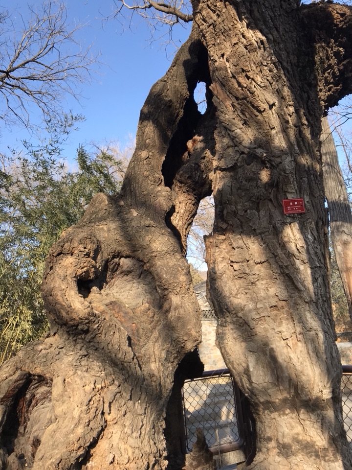 我只拍了其中的一棵,就在门口,中空的树干特别的显眼,岁月的痕迹在它的身上也印刻的太深,绕着树拍了一圈,除了一面看着还算一棵树外,哪一面看过去都像是一截枯死的树桩。