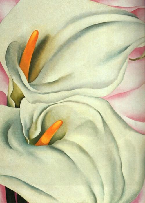 这一幅画也是美国女画家奥基弗画的,她画了许多的彩色马蹄莲和洁白的海芋,她画的两朵《海芋》代表着纯洁,甜美的寓意,而且,这一些海芋画出来了阴影部分,这是说明纯洁已经把忧郁给吓跑了😄。