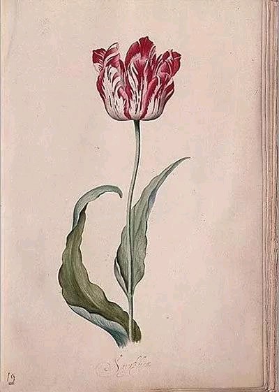 今天😊,这一幅画是荷兰非常著名的女画家朱迪思·莱斯特画的,她画的这一朵美丽的郁金香🌷它的叶子颇有动态感,而且,它还非常具有被狂风舞动的感觉,花瓣微微张开,感觉就要绽放出来它美丽的容颜。