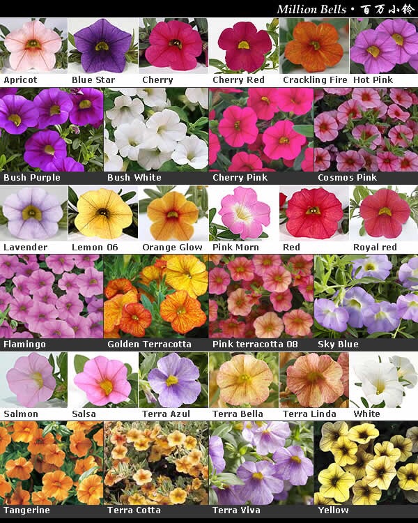 “百万小铃”的植物名称是“小花矮牵牛”,而“百万小铃”只是小花矮牵牛的一个品种。就好比矮牵牛的品种有潮波、美声、梦幻、海市蜃楼等等。小花矮牵牛的品种也有很多,如Million Bells(即百万小铃)、Calimor、Celebration、MiniFamous等等。可是目前大家不管品种对不对,只要是小花矮牵牛都叫做“百万小铃”,那就有点本末倒置了。