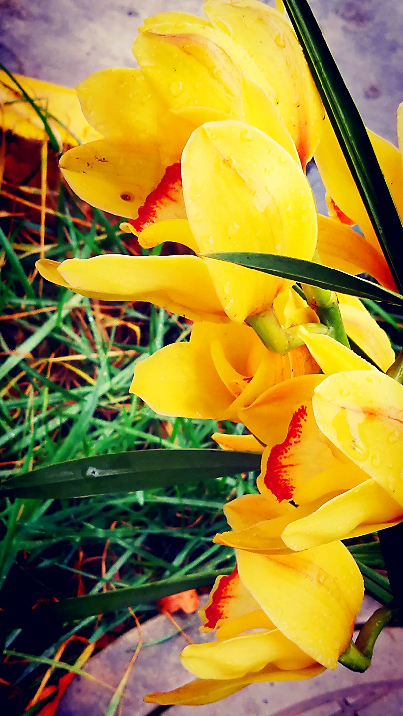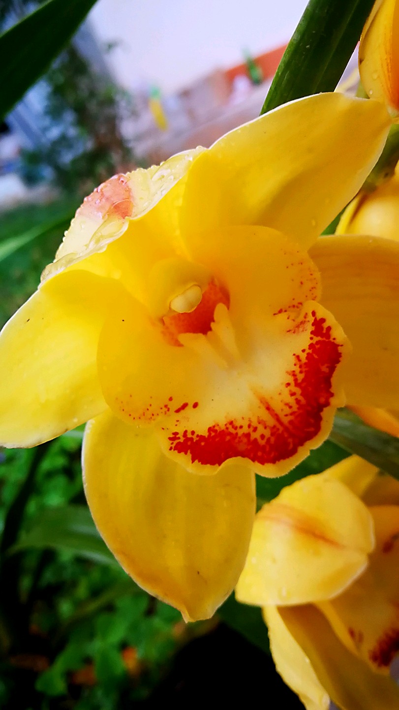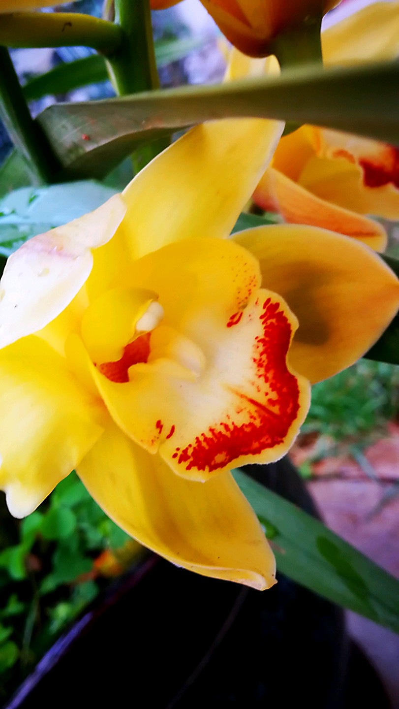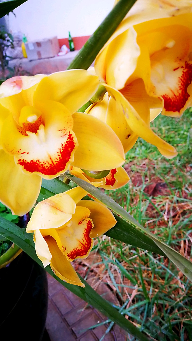 盆里一棵大花蕙兰开花儿了,又叫喜姆比兰;蝉兰。