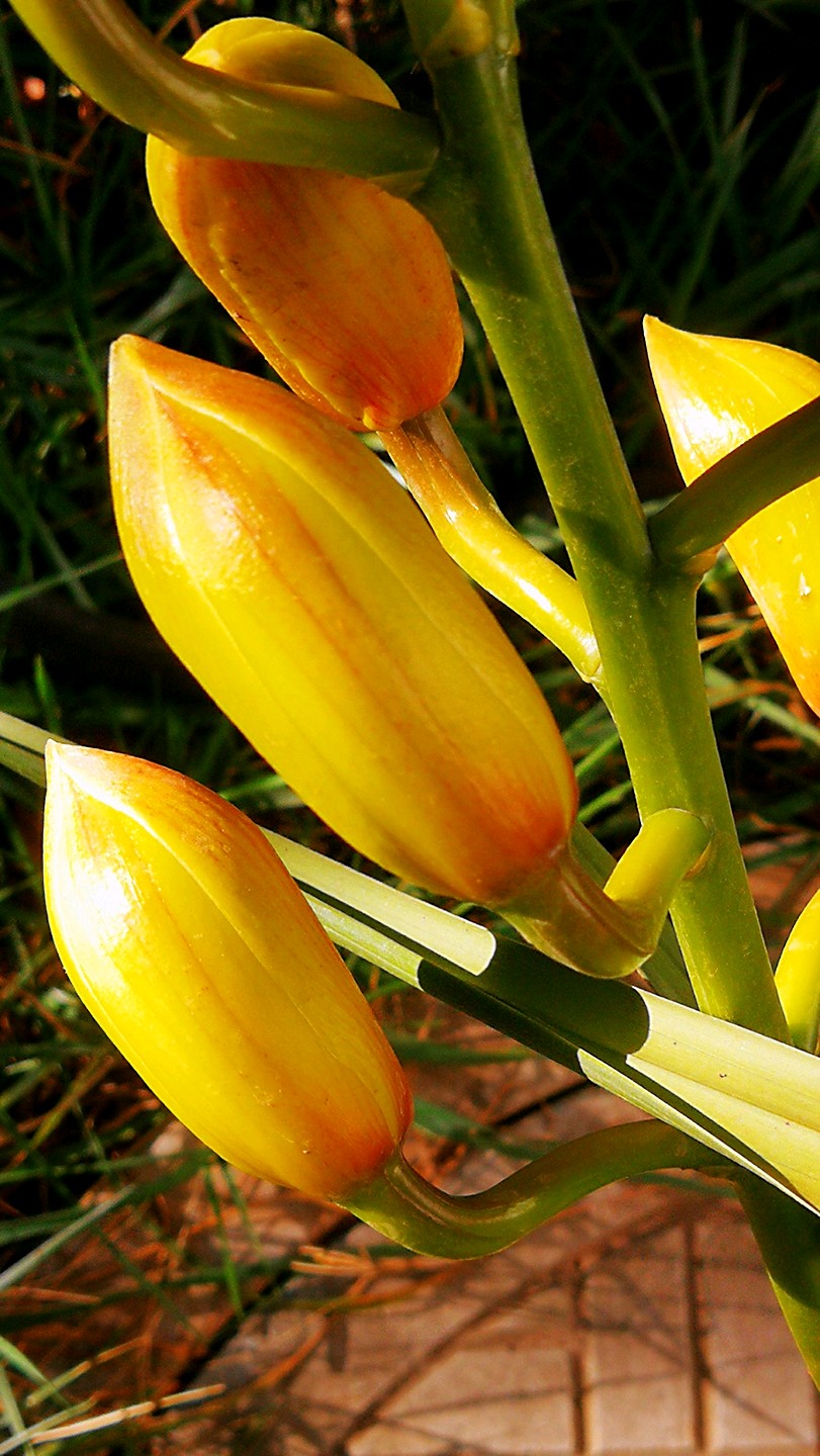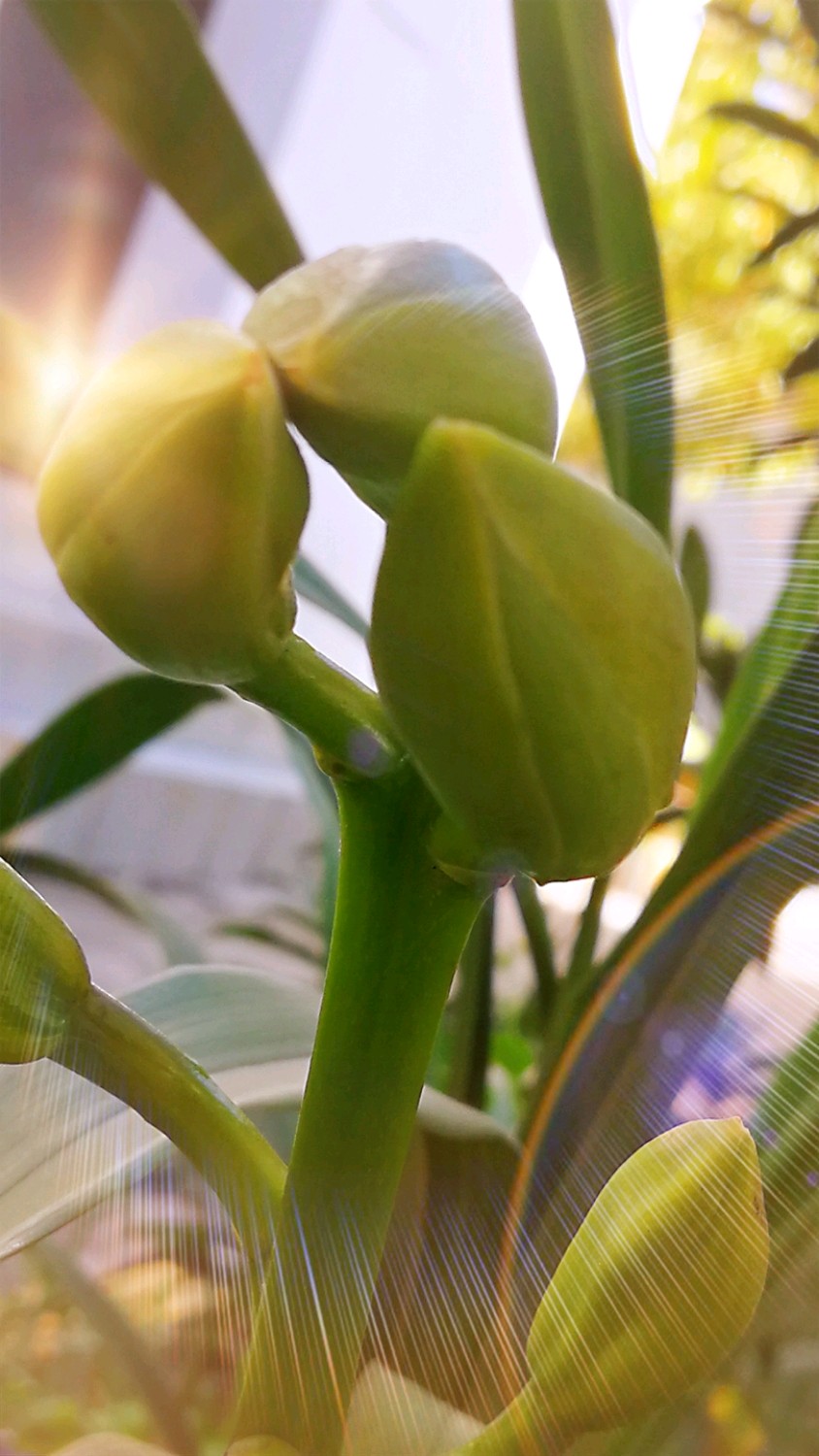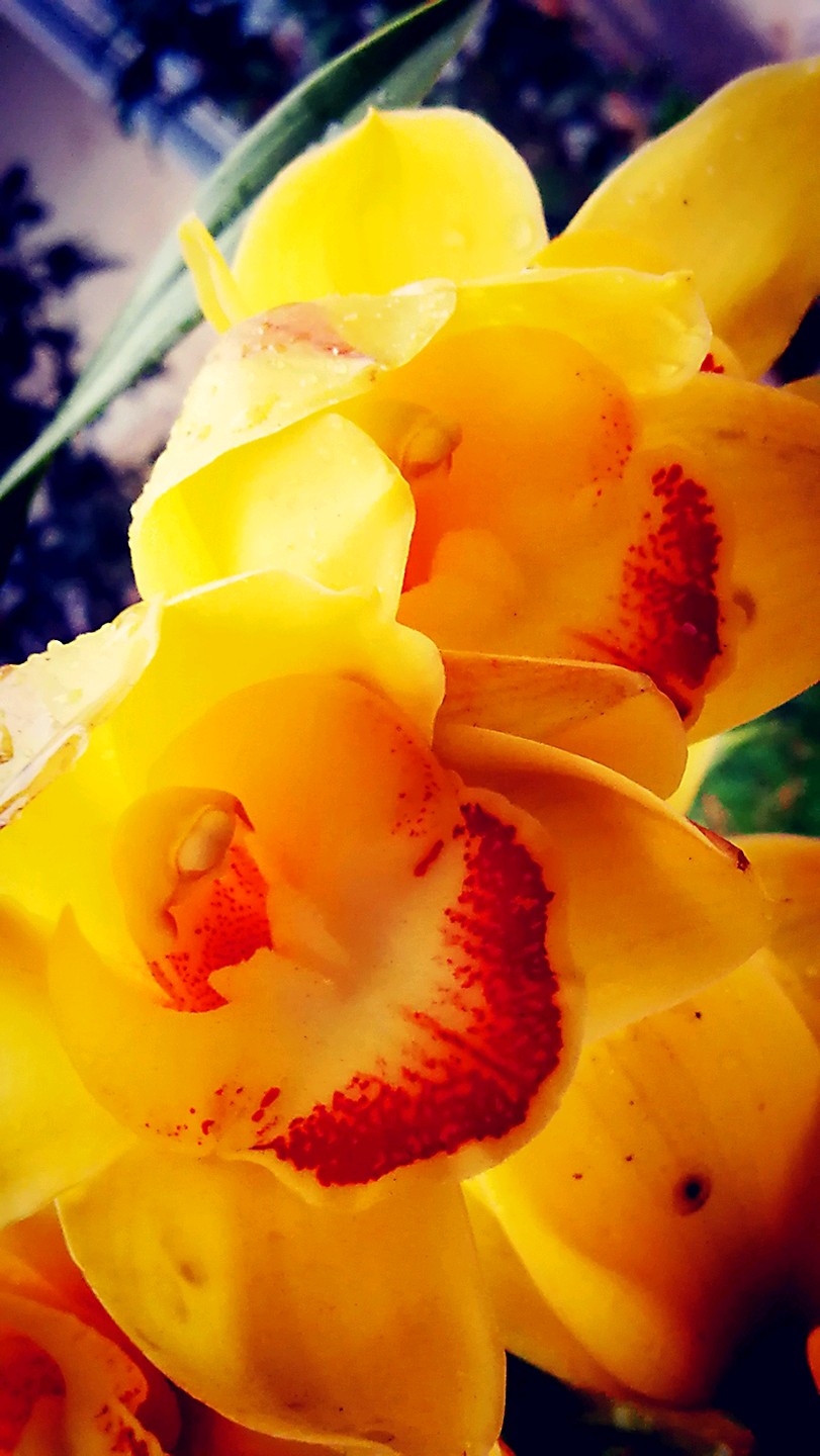 盆里一棵大花蕙兰开花儿了,又叫喜姆比兰;蝉兰。
